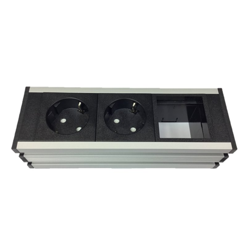 - Die Steckdosenleiste ist ausgestattet mit 2 Schukosteckdosen und Platz für 1-2 Kommunikationsmodule.
