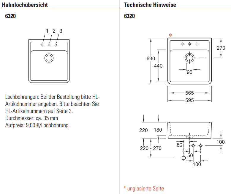 - Lochbohrung: bitte separat unter Zubehör bestellen