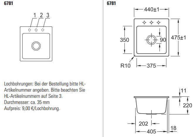 - Lochbohrung: bitte separat unter Zubehör bestellen.