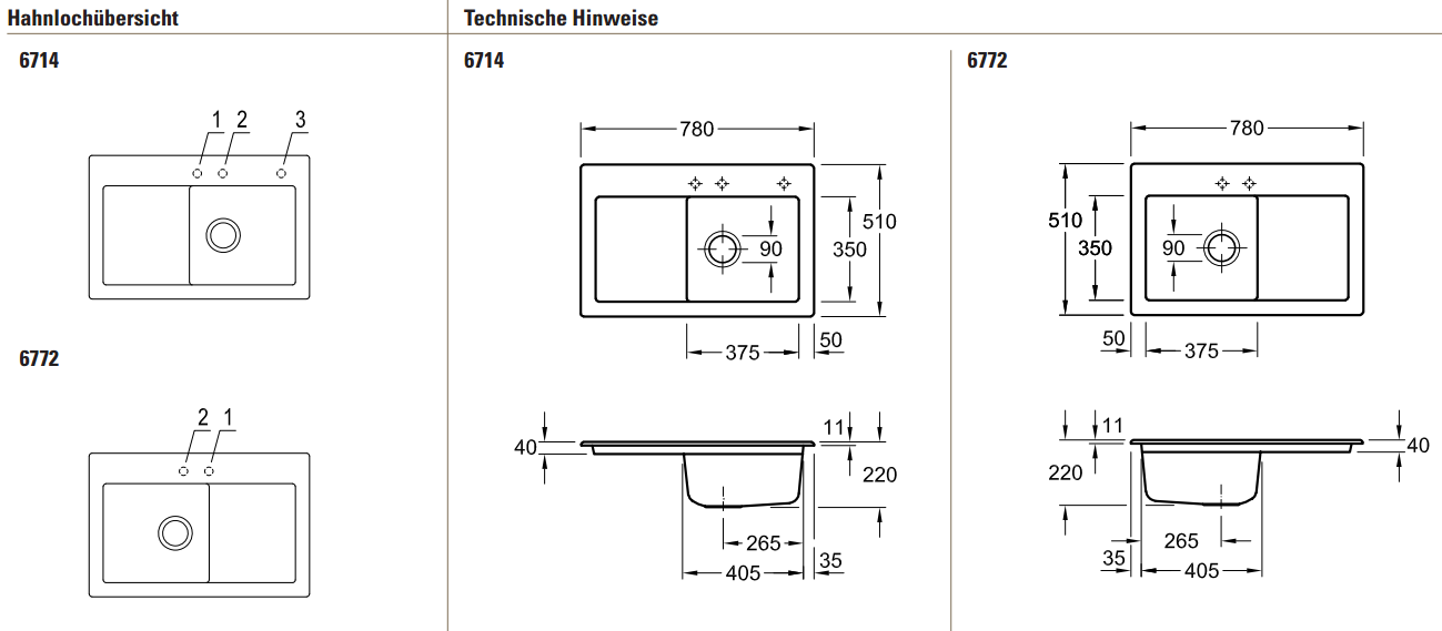 bei der Bestellung bitte die entspr. Lochbohrung-Art.Nr. angeben: entspricht der Position (= Ziffer 1 - 3) - siehe technische Zeichnung! - Geschmacksmuster geschützt!: "KW La Rose" = auf der Abtropffläche / "KT White Pearl" = auf der Hahnlochbank