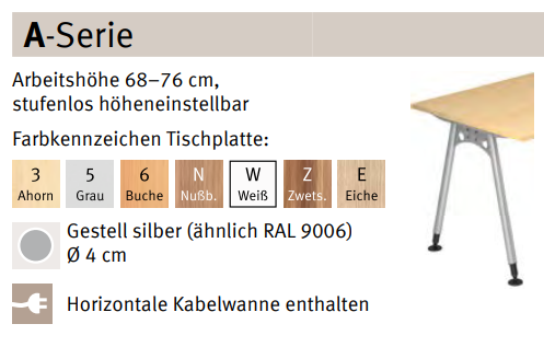 Ansatztisch LA60, 60 x 80 cm Platte: Dekor nach Wahl, 25 mm dick, 2 mm ABS-Kante gerundet zum Anbau an Schreibtisch Ansatztisch mit Stützfuß in Farbe nach Wahl Arbeitshöhe 68 - 85 cm Anlieferzustand: zerlegt, einfache Montage