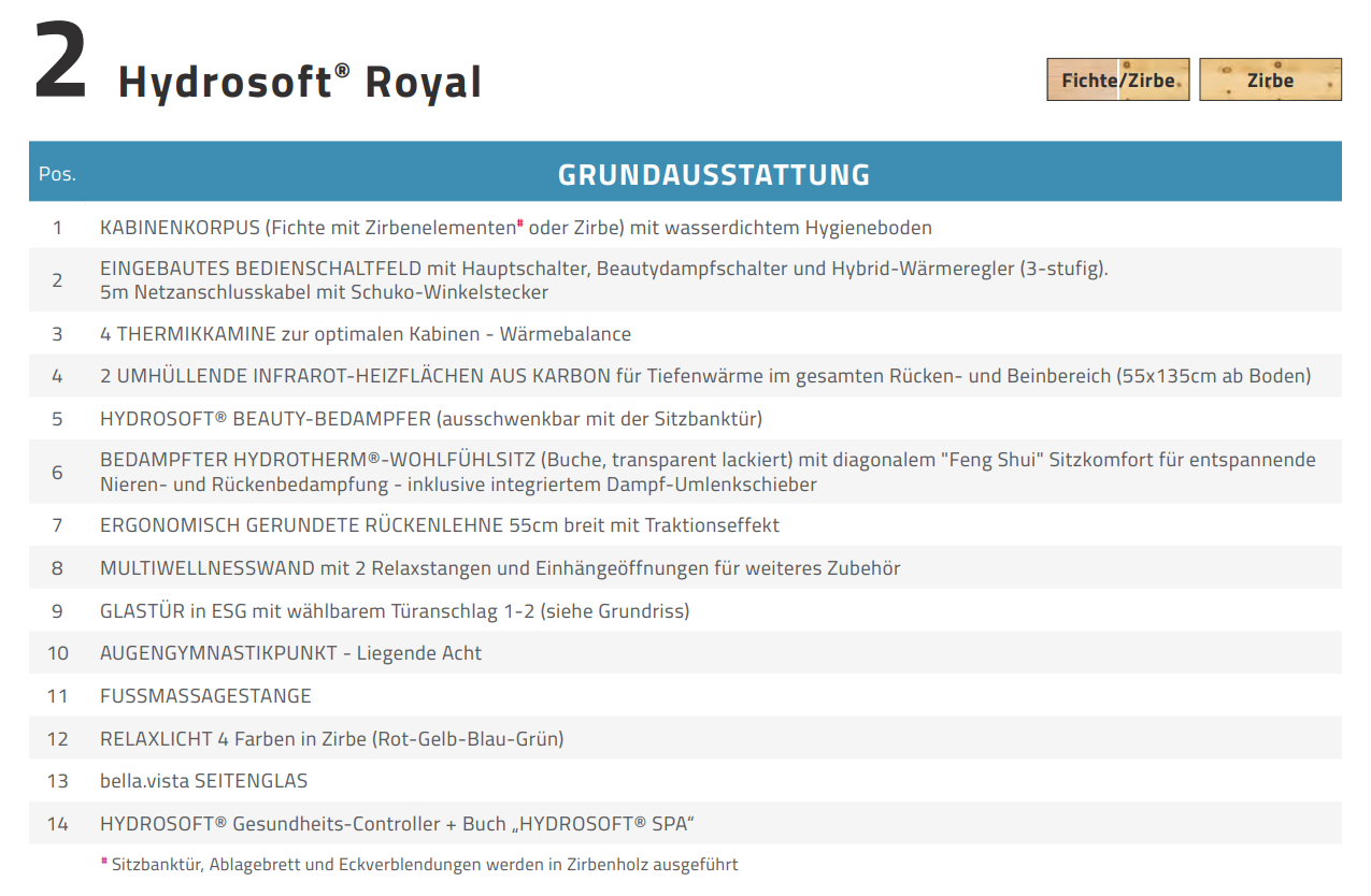 - Hydrosoft® Royal mit Saunaofen: 2,6 kW (1x Schukostecker-Absicherung 16A 230 V) - nähere Informationen siehe unter "Downloads" sowie ein Video unter "Links"