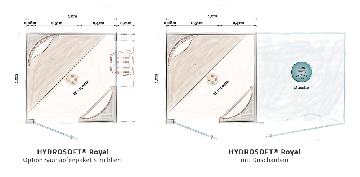 Für ein zusätzlich gesteigertes umhüllendes Wärmeerlebnis verfügt die Hydrosoft Royal über eine Wärmefläche im Rücken- und im Frontbereich (mit integrierter Multi-Fitnessswand). Durch die diagonale Ausrichtung eignet sich die Kabine perfekt für die Eckaufstellung in Ihrem Zuhause oder im Hotel.