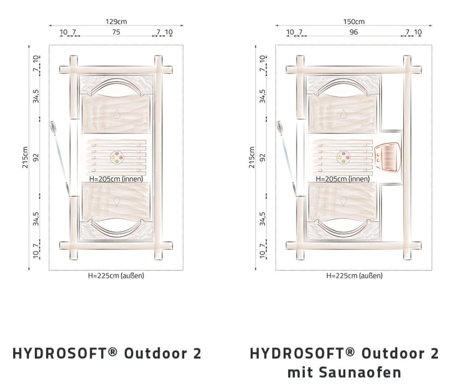 - Hydrosoft® Outdoor 2: 1,9 kW + 2,3 kW Saunaofen - Empfohlene Temperatur bis -5°C. Elektroanschluss bauseits durch örtlichen Elektriker.