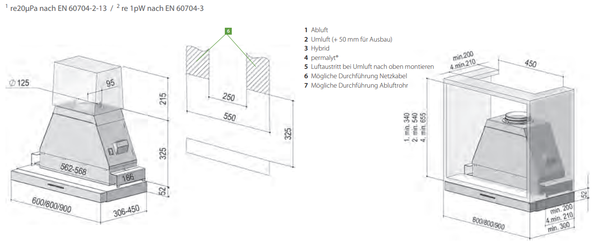 - empfohlener Abstand zum Kochfeld: 55 cm, (Gaskochfeld > 65 cm)