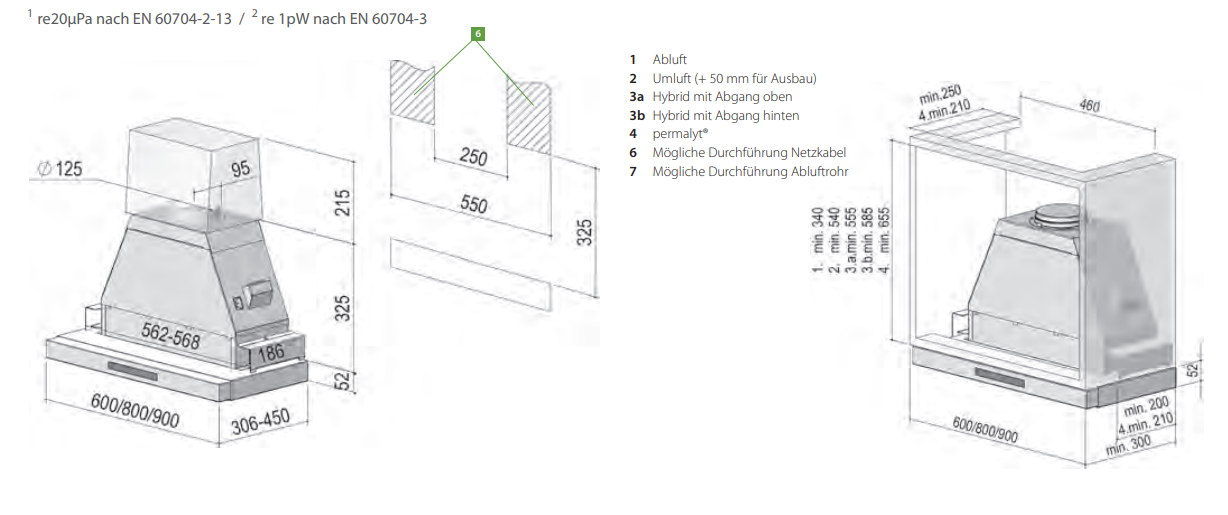 - empfohlener Abstand zum Kochfeld: 55 cm, (Gaskochfeld > 65 cm)