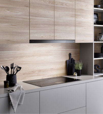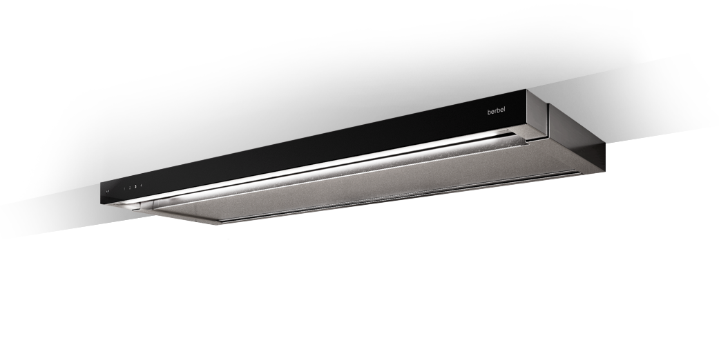 Die klare Optik und der perfekte Eindruck entstehen durch das in Perfektion verarbeitete bruchsichere Glas der Frontblende. Die nahtlose, cleane Optik wird durch das im ausgeschalteten Zustand unsichtbare Bedienfeld, das sich komplett hinter Glas befindet, unterstrichen. Sichtbar bleibt lediglich die on/off Bedienvertiefung. Für eine klare Unterlinie der Oberschränke lässt sich diese elegante Einbauhaube auch in einen gekürzten Oberschrank einplanen. Dank der schlanken Form bleibt im Oberschrank noch genug Platz für ein Gewürzregal.