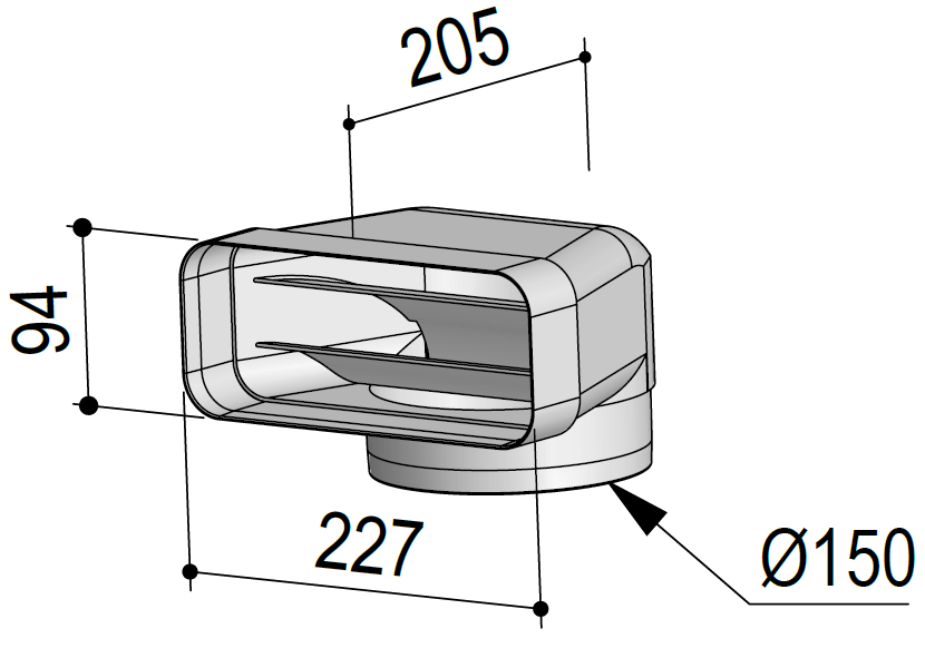 • System 150: 90°-Umlenkstück auf flach 227 x 94 mm außen, rund auf flach mit Luftleitkörper
