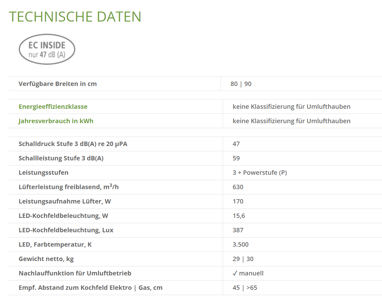 - Energieeffizienzklasse: keine Klassifizíerung für Umlufthauben