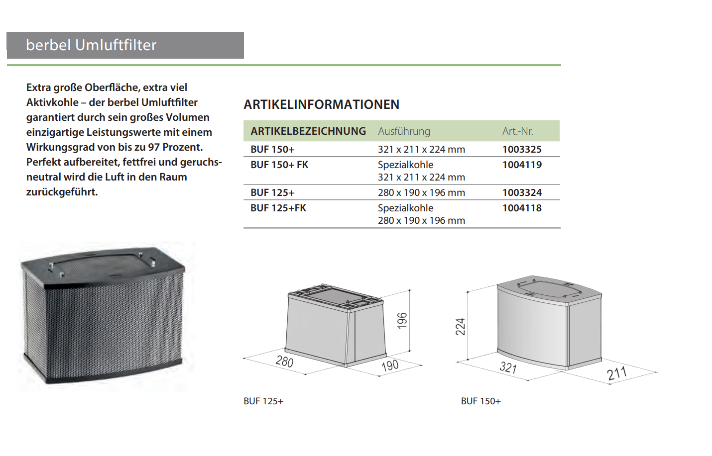 Extra große Oberfläche, extra viel Aktivkohle - der berbel Umluftfilter überzeugt mit einem Wirkungsgrad von 97 Prozent. Perfekt aufbereitet, fettfrei und geruchsneutral wird die Luft in den Raum zurückgeführt. Ein Austausch der Aktivkohle ist lediglich alle zwei bis drei Jahre erforderlich und das Filtergehäuse bleibt ein ganzes Hauben-Leben lang erhalten. Eine echt starke, umweltfreundliche und kostensparende berbel-Lösung für reine Küchen-Luft!