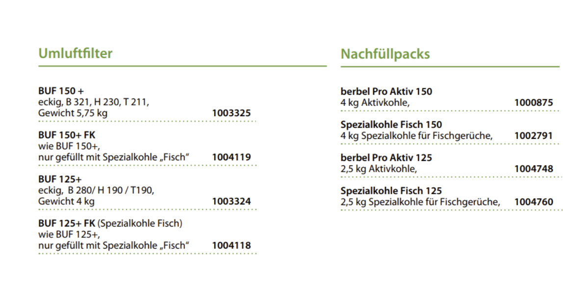 Und so funktioniert der berbel Umluftfilter: Zunächst wird das Fett aus den Kochwrasen herausgeschleudert dank berbel Prinzip. Dann kommt der Umluftfilter ins Spiel: Er befindet sich im oberen Teil der berbel Dunstabzugshaube. Mit der großen Oberfläche und den 4,4 kg Aktivkohle bindet er die Geruchsmoleküle und befreit die Luft im Nu von störenden Gerüchen. Von Gerüchen gereinigt wird die Luft dann wieder zurück in den Raum geführt. Zum Austausch der Aktivkohle bieten wir kostengünstige Nachfüllpacks an. Für Fischliebhaber empfehlen wir unsere spezielle Aktivkohle Fisch. Für ganz entspanntes Kochen.