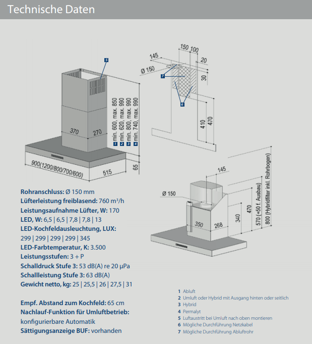 - Mindesthöhe Schacht für Kombination Umluftfilter / Hybridfilter: 850 mm