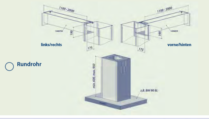 Individuelle Schachthöhen ohne Aufpreis in 50 mm Schritten von 600 mm bis 950 mm für den Abluftbetrieb und 700 bis 950 für den Umluftbetrieb