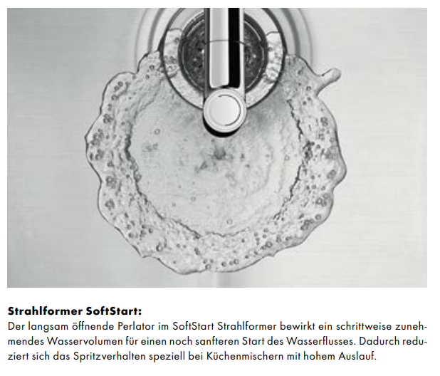 - Weniger Wasserspritzer: Der Durchfluss wird beim Aufdrehen automatisch sanft gesteigert (SoftStart)