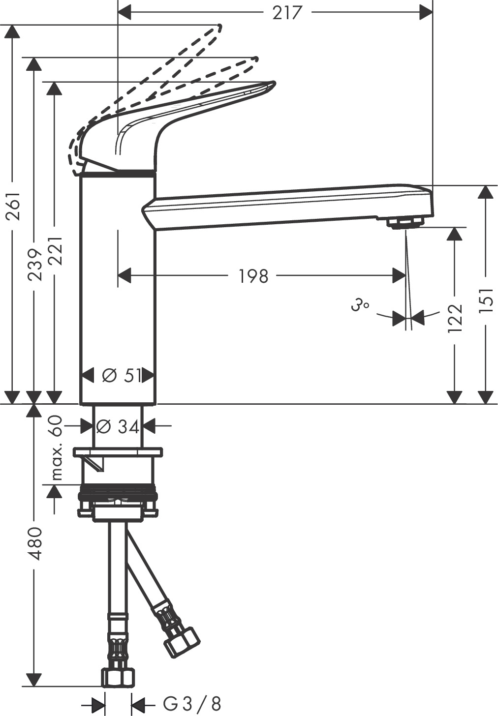 - Wasser sparen: In der ersten Hebelstellung (Eco) wird der Durchfluss um etwa 50 % reduziert. Erst voll geöffnet fließen bis zu 11,5 l/min (bei 3 bar)