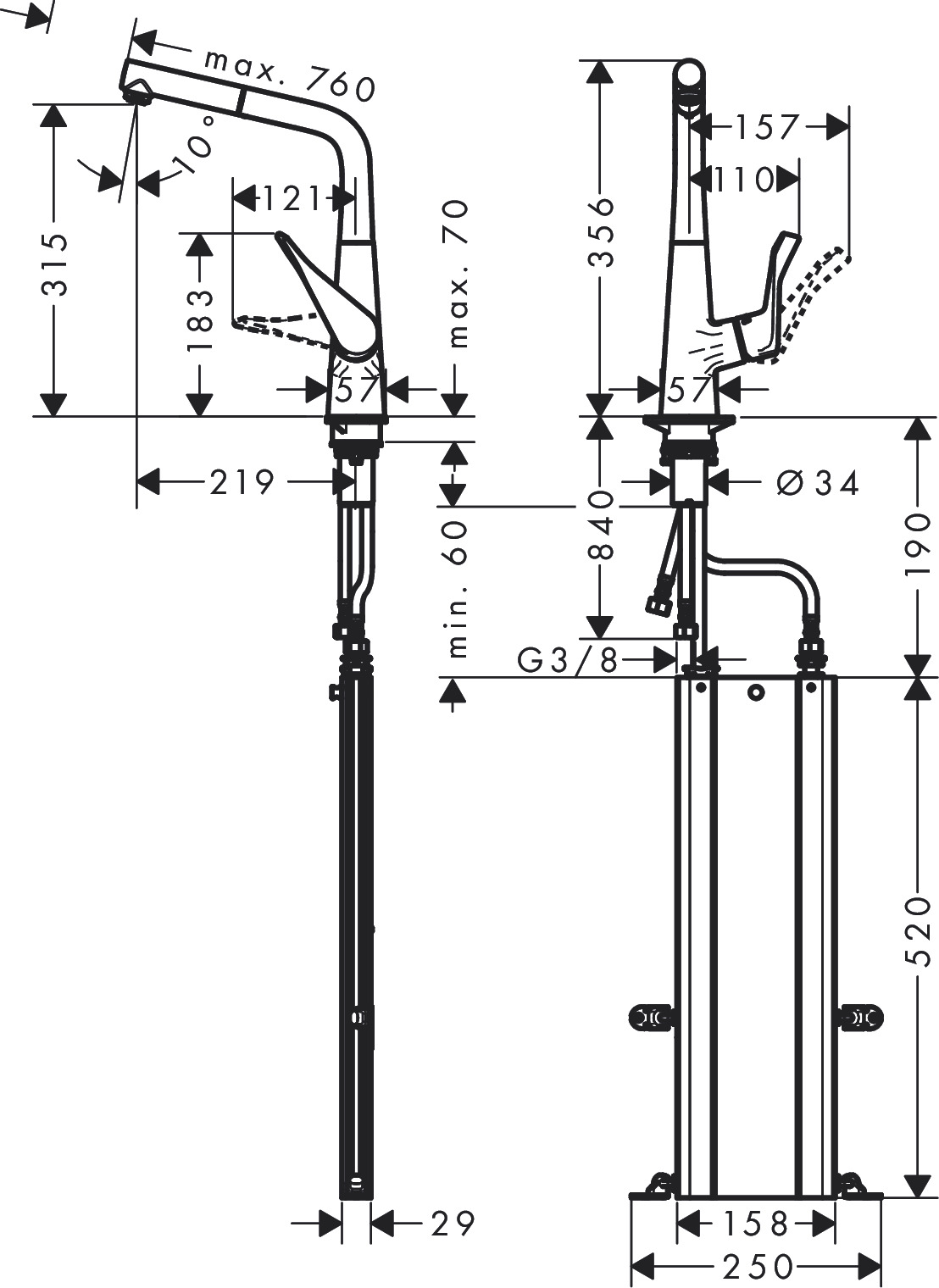 - Mehr Bewegungsfreiheit: großer Abstand zwischen Auslauf und Spülbecken (ComfortZone 320). In 2 Stufen einstellbarer Schwenkauslauf (110° oder 150°)