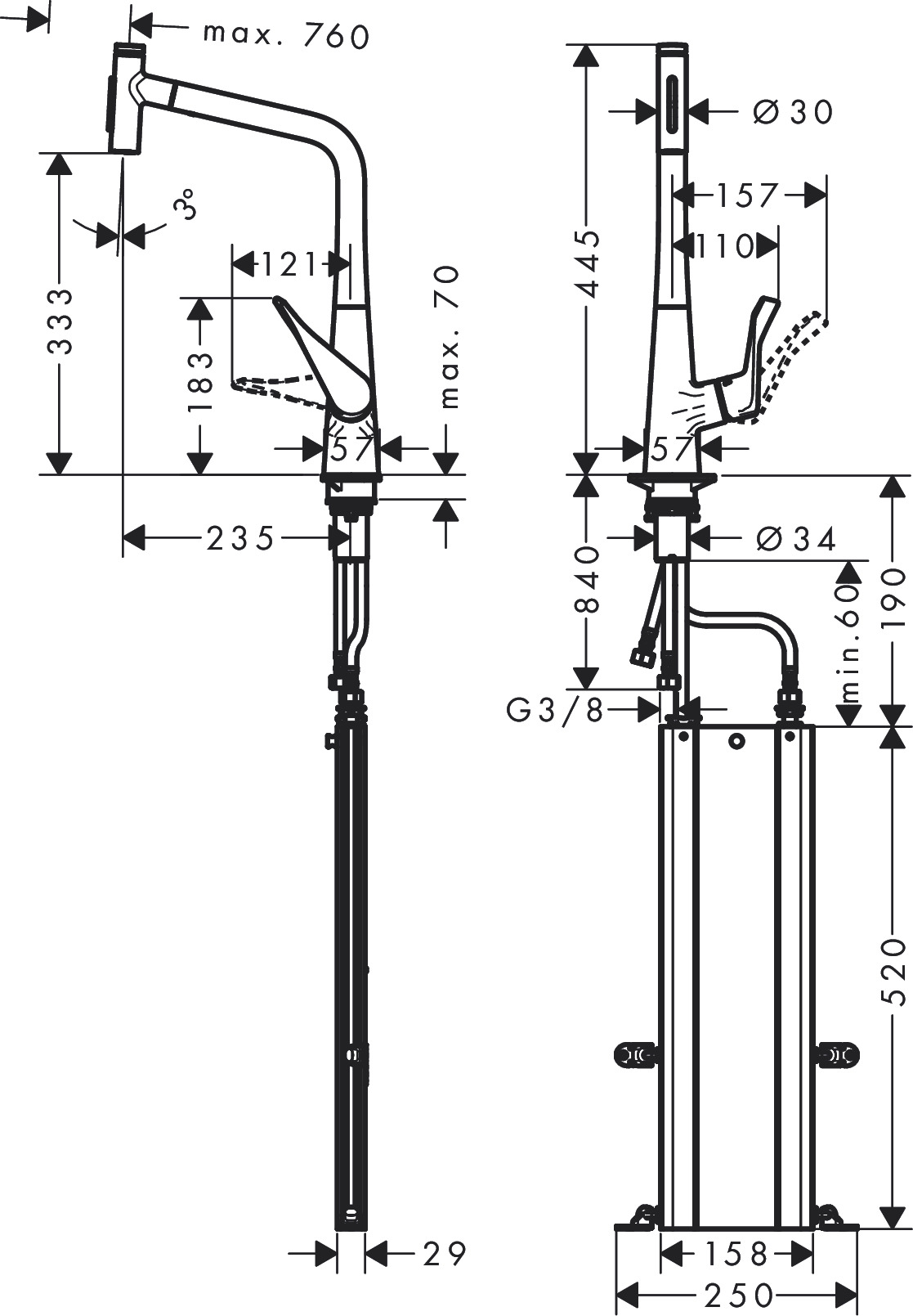 - Viel Bewegungsfreiheit: 333 mm Abstand zwischen Wasserauslauf und Spülbecken (ComfortZone 320) sowie um 110°/150° schwenkbarer Auslauf