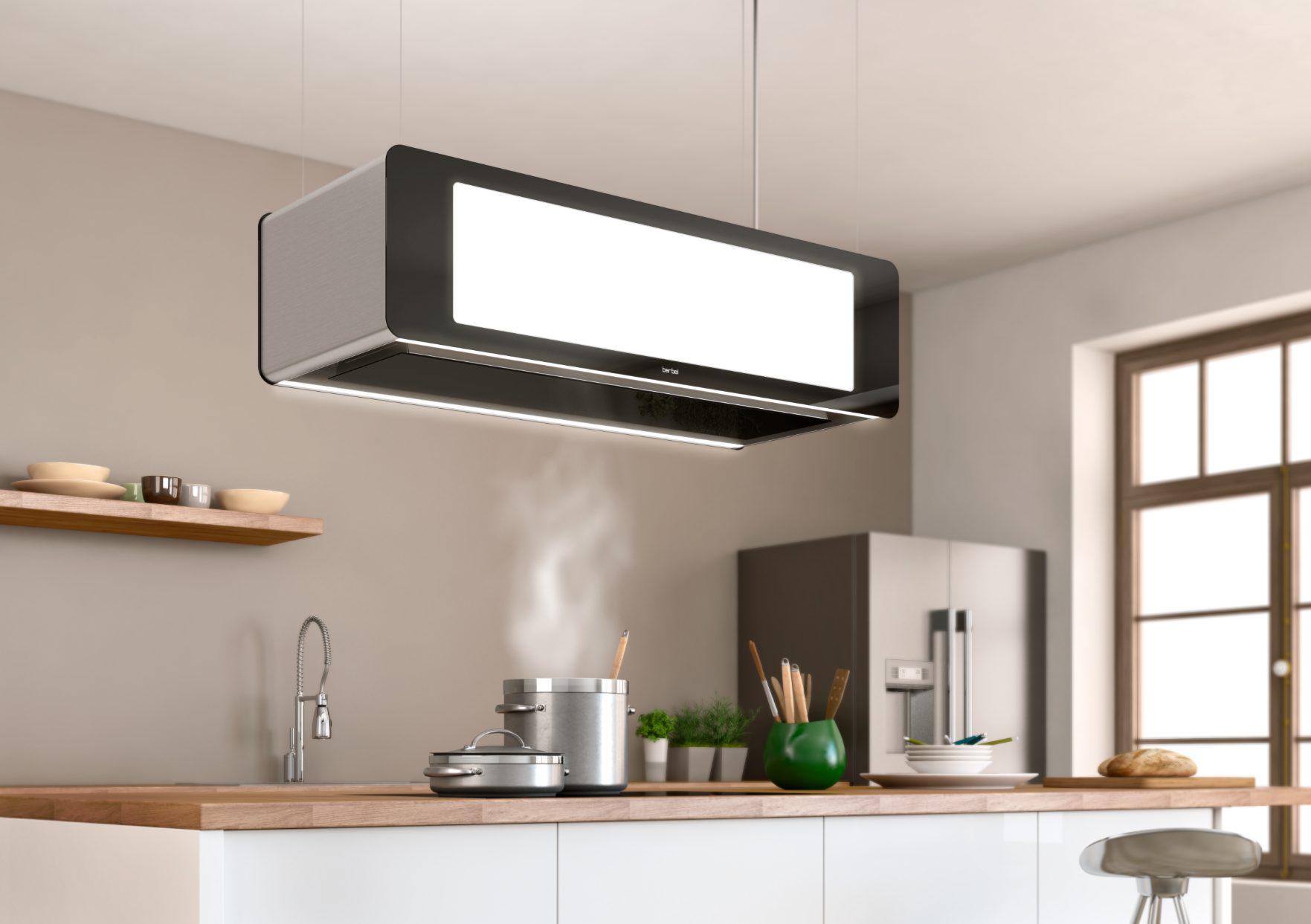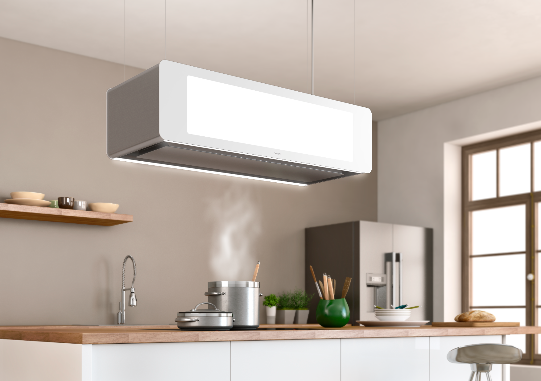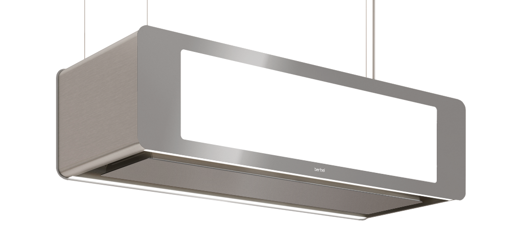 In der Grundversion ist die berbel Deckenlifthaube Skyline mit energieeffizientem EC-Lüftermotor, Liftfunktion, getrennt schaltbarer Effektbeleuchtung, Edelstahl-Deckenplatte und LED-Kochfeldausleuchtung ausgestattet. Durch die Kombination mit der innovativen JetStream-Technologie ist die Deckenlifthaube Skyline auch für den energiesparenden EcoSwitch-Betrieb geeignet. Damit passt sich die berbel Dunstabzugshaube jedem Kochverhalten individuell an. Darüber hinaus bietet berbel weitere Deckenanschlussmöglichkeiten an, wie zum Beispiel den in der obigen Bildabfolge gezeigten Deckenanschluss mit Voll- oder Teilversenkbarkeit der Dunstabzugshaube in der Decke.
