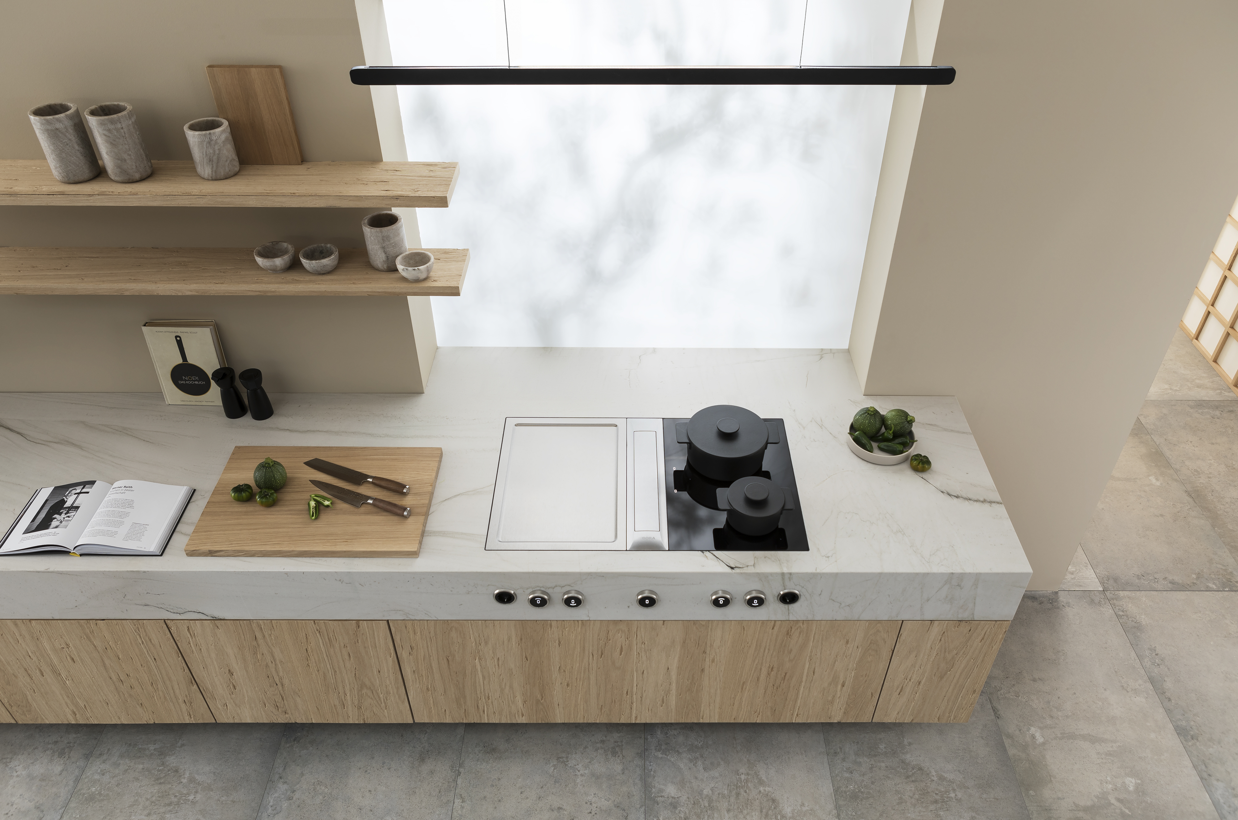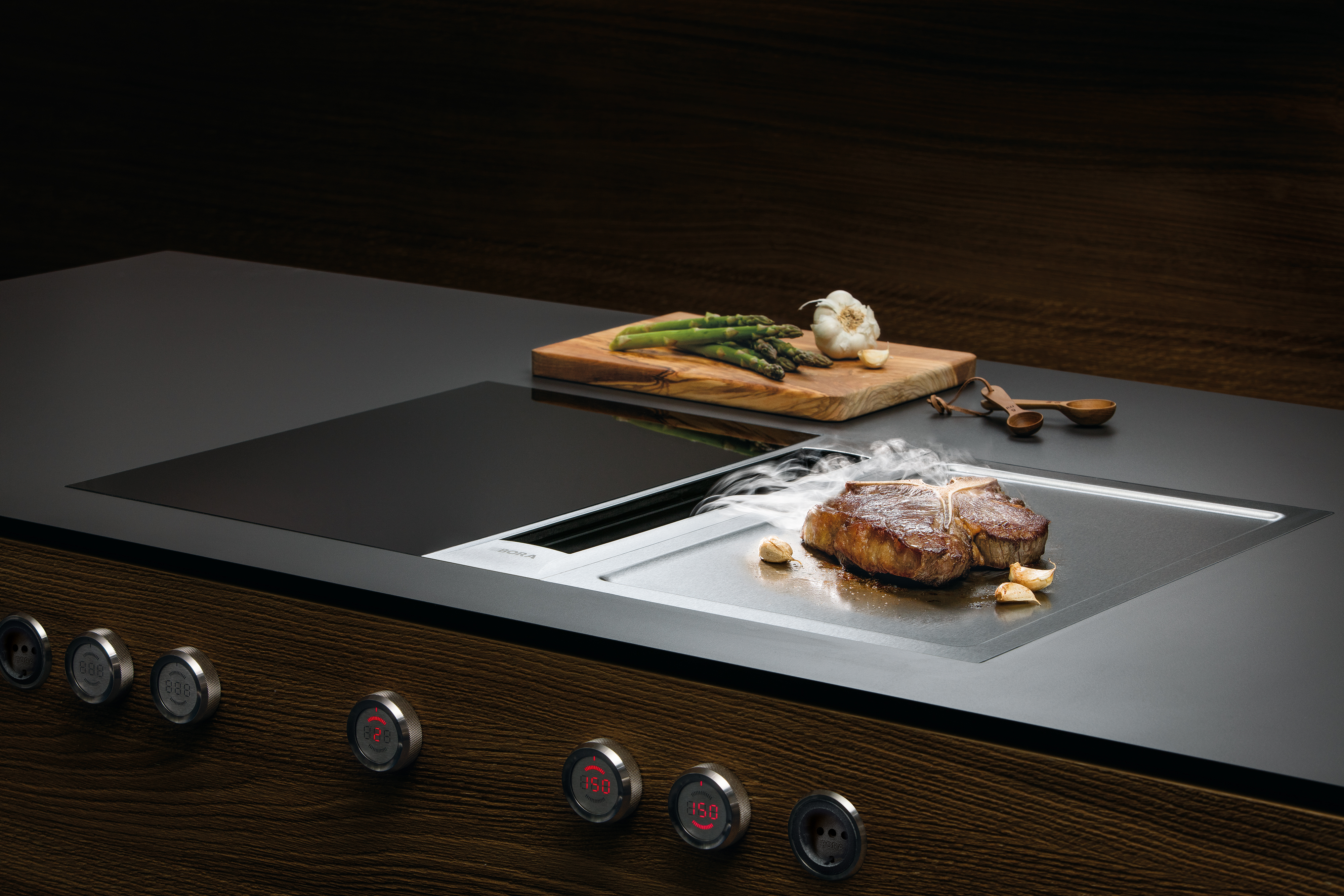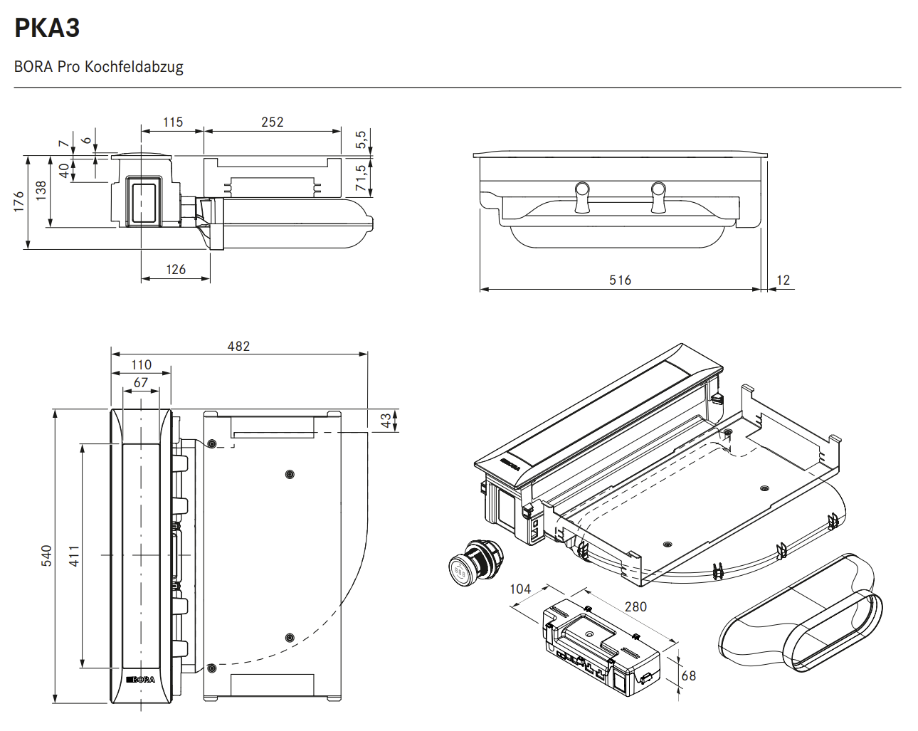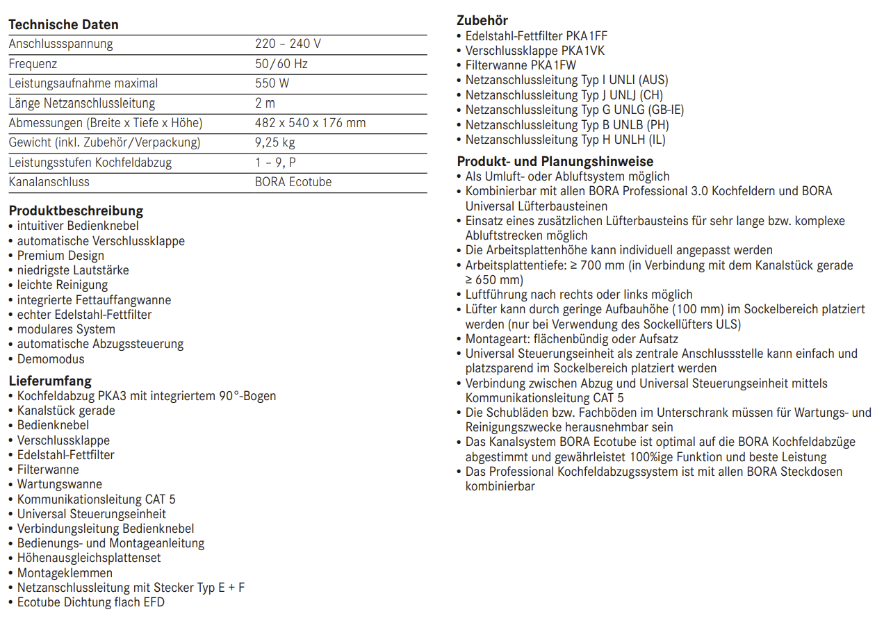 ? Als Umluft- oder Abluftsystem möglich ? Kombinierbar mit allen BORA Professional 3.0 Kochfeldern und BORA Universal Lüfterbausteinen ? Einsatz eines zusätzlichen Lüfterbausteins für sehr lange bzw. komplexe Abluftstrecken möglich ? Die Arbeitsplattenhöhe kann individuell angepasst werden ? Arbeitsplattentiefe: ? 700 mm (in Verbindung mit dem Kanalstück gerade ? 650 mm) ? Luftführung nach rechts oder links möglich ? Lüfter kann durch geringe Aufbauhöhe (100 mm) im Sockelbereich platziert werden (nur bei Verwendung des Sockellüfters ULS) ? Montageart: flächenbündig oder Aufsatz ? Universal Steuerungseinheit als zentrale Anschlussstelle kann einfach und platzsparend im Sockelbereich platziert werden ? Verbindung zwischen Abzug und Universal Steuerungseinheit mittels Kommunikationsleitung CAT 5 ? Die Schubläden bzw. Fachböden im Unterschrank müssen für Wartungs- und Reinigungszwecke herausnehmbar sein ? Das Kanalsystem BORA Ecotube ist optimal auf die BORA Kochfeldabzüge abgestimmt und gewährleistet 100%ige Funktion und beste Leistung ? Das Professional Kochfeldabzugssystem ist mit allen BORA Steckdosen kombinierbar