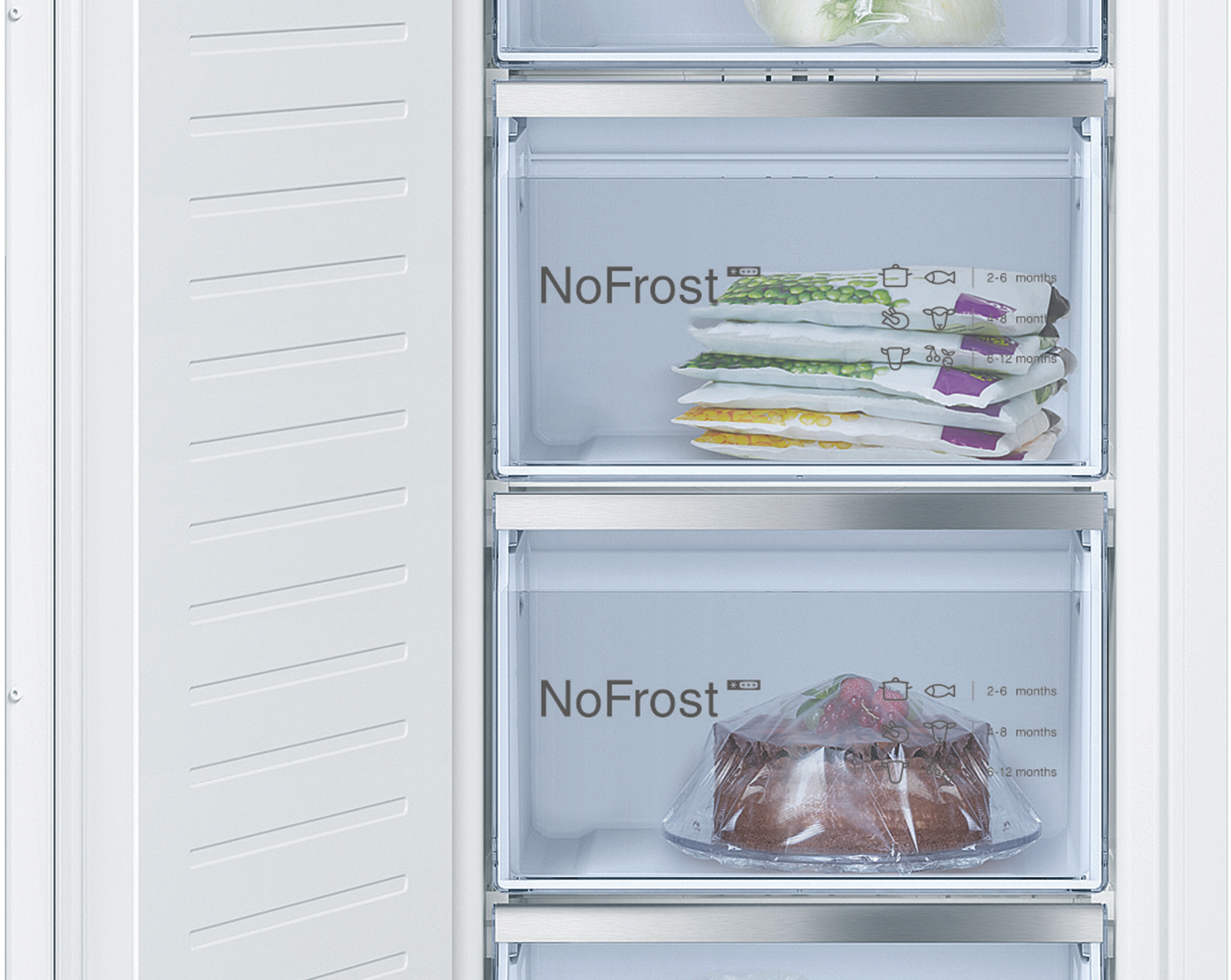 Dieser NoFrost-Einbaugefrierschrank muss nicht abgetaut werden und verfügt über ein Störungswarnsignal im Falle eines Temperaturanstiegs.
