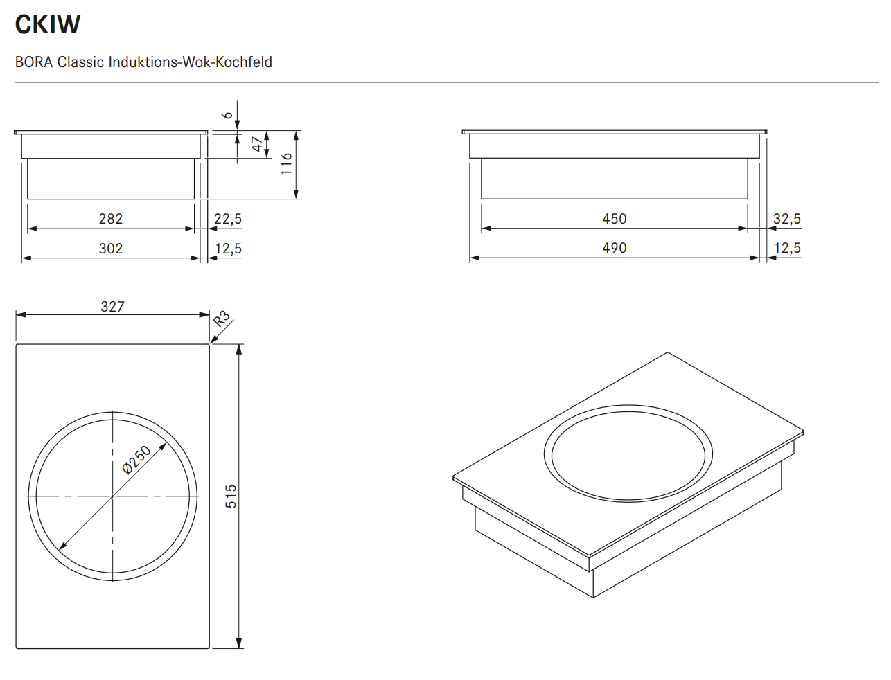 ? Das Gerät kann aufgrund der Bauhöhe von 116 mm nicht über der Abluftführung installiert werden ? Sorgen Sie unterhalb des Kochfeldes für ausreichend Belüftung ? Glaskeramik-Ausformung: Durchmesser 250 mm ? Verwenden Sie einen Wok, welcher bei steigender Temperatur seine magnetischen Eigenschaften verliert (Überhitzungsschutz). Wir empfehlen die Verwendung der von uns angebotenen Wok-Pfanne