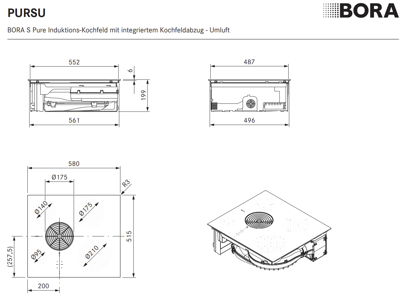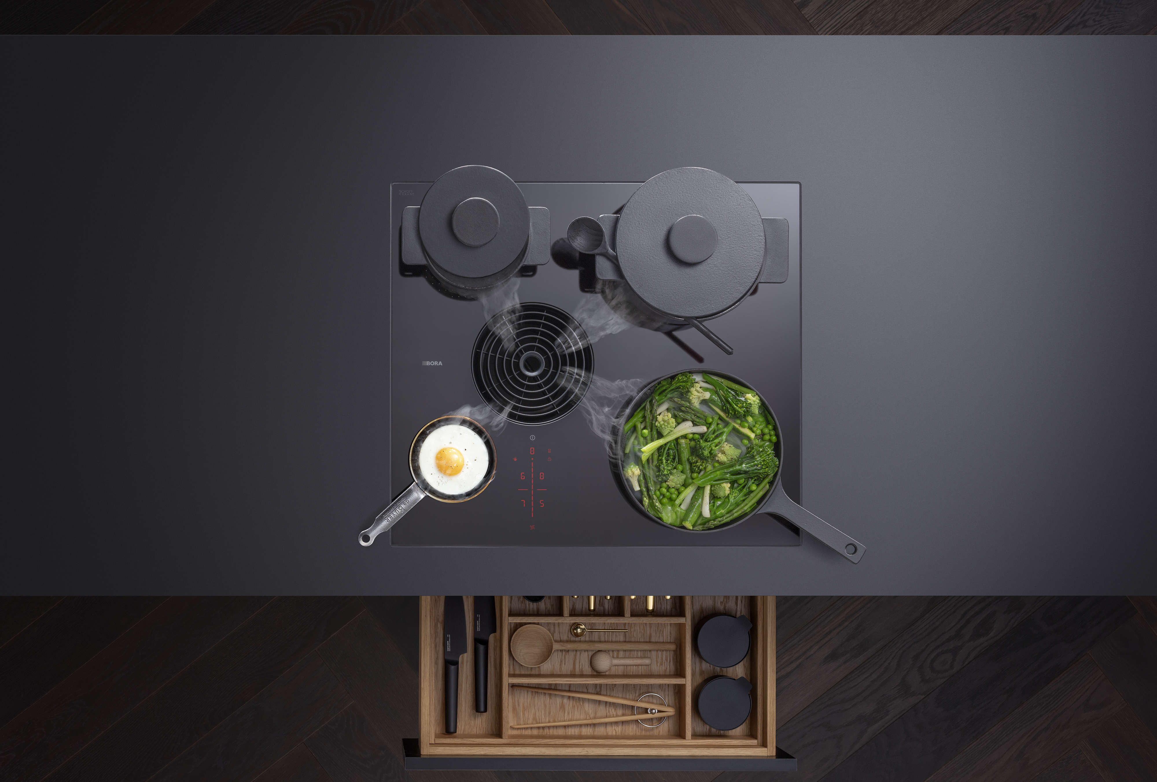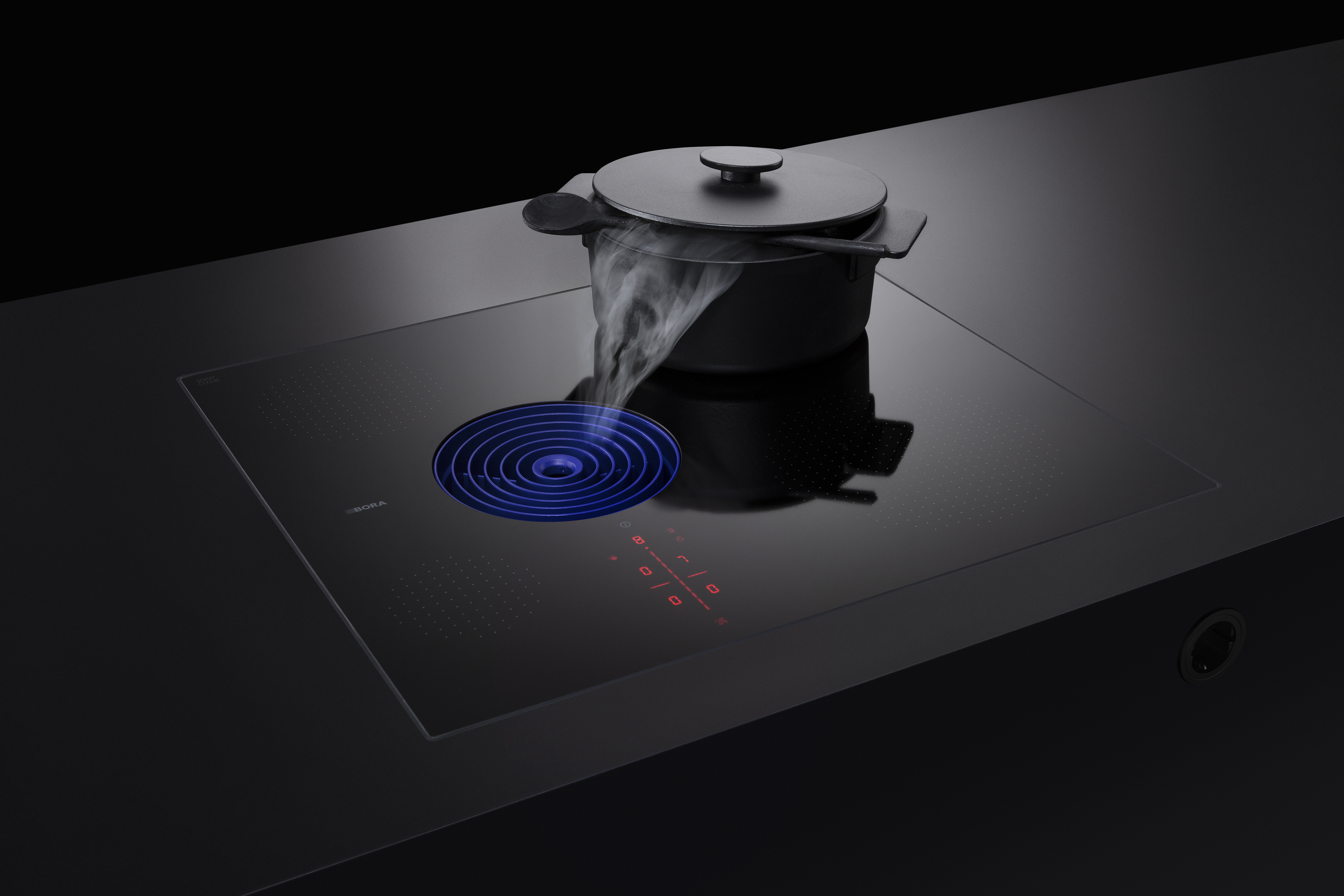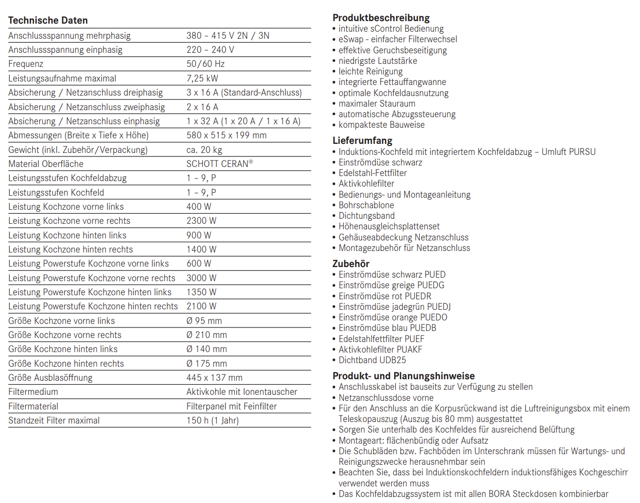 ? Anschlusskabel ist bauseits zur Verfügung zu stellen ? Netzanschlussdose vorne ? Für den Anschluss an die Korpusrückwand ist die Luftreinigungsbox mit einem Teleskopauszug (Auszug bis 80 mm) ausgestattet ? Sorgen Sie unterhalb des Kochfeldes für ausreichend Belüftung ? Montageart: flächenbündig oder Aufsatz ? Die Schubläden bzw. Fachböden im Unterschrank müssen für Wartungs- und Reinigungszwecke herausnehmbar sein ? Beachten Sie, dass bei Induktionskochfeldern induktionsfähiges Kochgeschirr verwendet werden muss ? Das Kochfeldabzugssystem ist mit allen BORA Steckdosen kombinierbar
