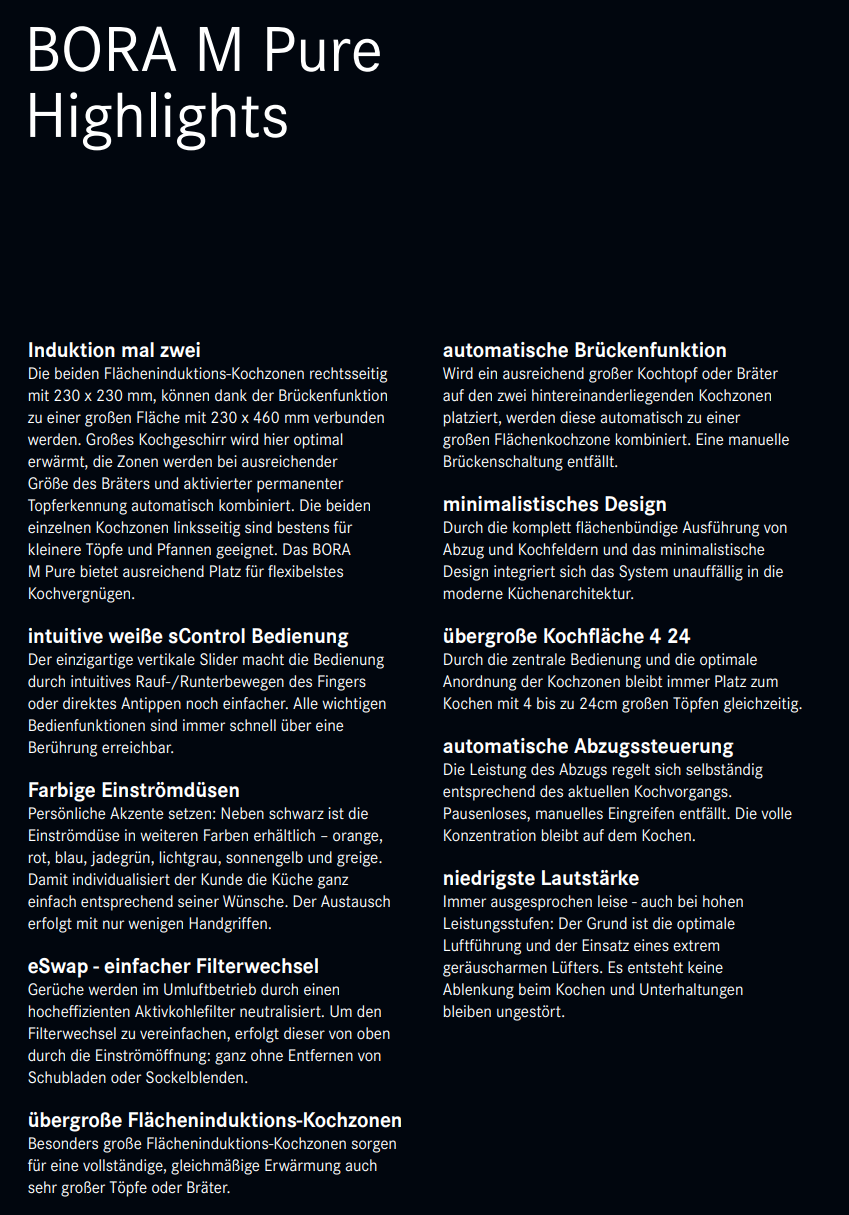 Netzanschlussleitung ist bauseits zur Verfügung zu stellen Netzanschlussdose vorne Für den Anschluss an die Korpusrückwand ist die Luftreinigungsbox mit einem Teleskopauszug (Auszug bis 80 mm) ausgestattet Bei übertiefen Kochfeldunterschränken kann der Teleskopauszug der Luftreinigungsbox mit dem zusätzlichen Teleskopauszug PULBTA um 105 mm verlängert werden (als Zubehör erhältlich) Sorgen Sie unterhalb des Kochfeldes für ausreichend Belüftung Montageart: flächenbündig oder Aufsatz Die Schubläden bzw. Fachböden im Unterschrank müssen für Wartungs- und Reinigungszwecke herausnehmbar sein Beachten Sie, dass bei Induktionskochfeldern induktionsfähiges Kochgeschirr verwendet werden muss Das Kochfeldabzugssystem ist mit allen BORA Steckdosen kombinierbar Keine Kompatibilität mit BORA Universallüftern (bei PURMA)