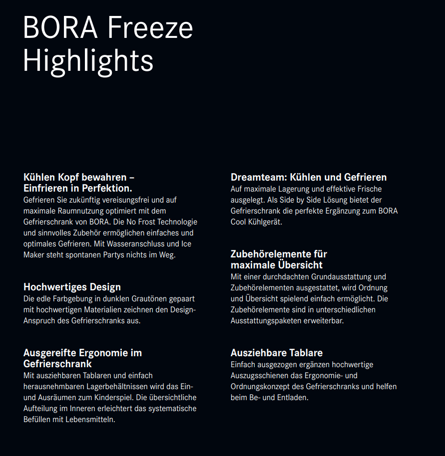 BORA Fresh zero Ice Maker inkl. Festwasseranschluss No Frost Frische Luft Premium Design Einfache Handhabung Hohe Flexibilität & Funktionalität Ausstattungspakete und Zubehör individuell wählbar Leichte Reinigung BORA Connect - Connectivity integriert