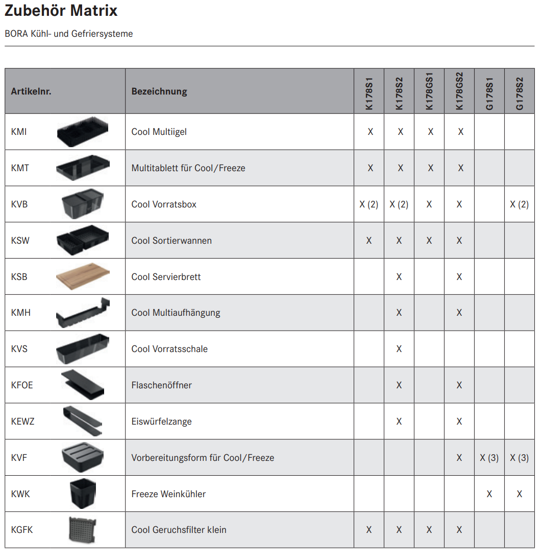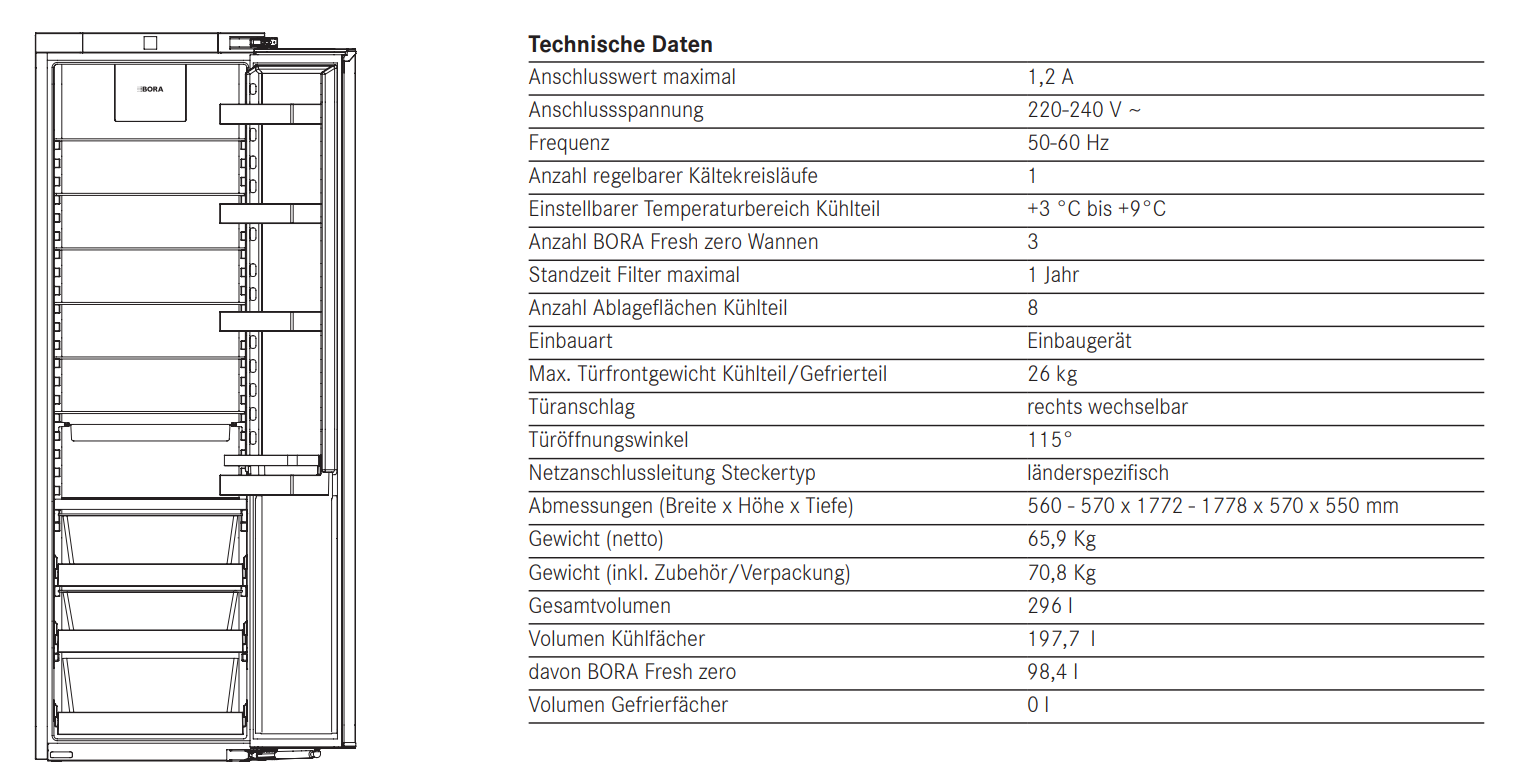 6x höhenverstellbare Glasplatten 1x höhenverstellbarer Flaschenabsteller inkl. Silikonmatte 3x höhenverstellbare Konservenabsteller inkl. Silikonmatte 3x herausnehmbare BORA Fresh zero Wannen inkl. Auszugstablare und 2x Feuchteregulierungsdeckel 1x Trennebene inkl. Multimatte 1x Geruchsfilter 1x Lüfterabdeckung Trockene Rückwand Kühlteil Gedämpfte Auszüge LED-Multilevel-Beleuchtung / LED-Lichtquellen