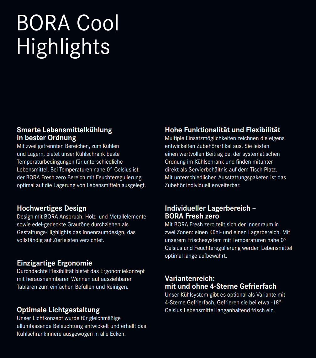 BORA Fresh zero Frische Luft - Geruchsfiltration, Umluftkühlung Premium Design Einfache Handhabung Hohe Flexibilität & Funktionalität Ausstattungspakete und Zubehör individuell wählbar Leichte Reinigung BORA Connect - Connectivity integriert