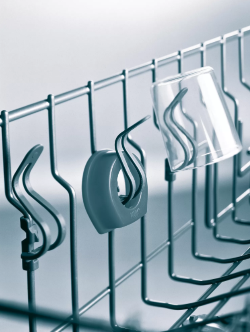 Kleine, leichte Kunststoffteile wie z. B. Trinkbecher oder Deckel werden während des Spülens oftmals durch Wasserstrahlen von ihrem Platz weggesprüht. Der neue Halteclip für Kleinteile, am Oberkorb befestigt, fixiert nun diese Teile optimal.
