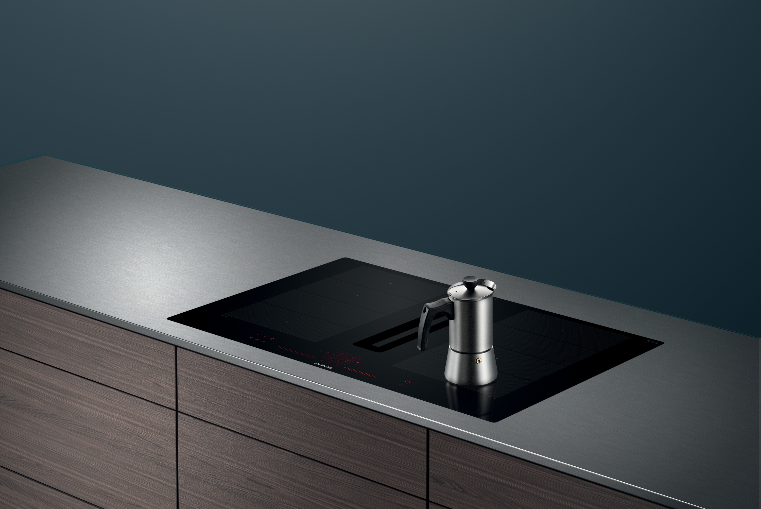 Induktionskochfeld mit vollintegriertem, leistungsstarkem Downdraft-Abzugsmodul.