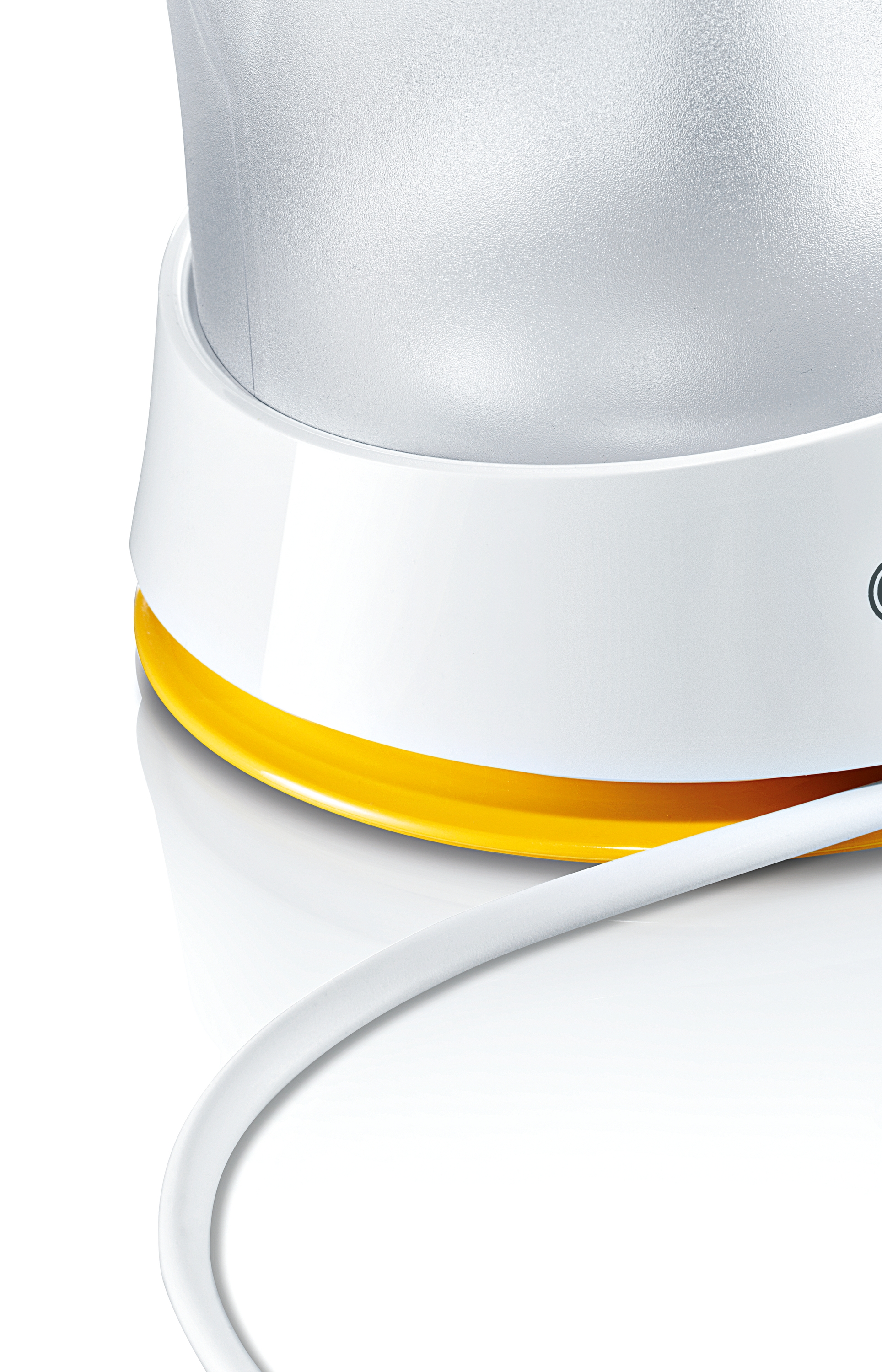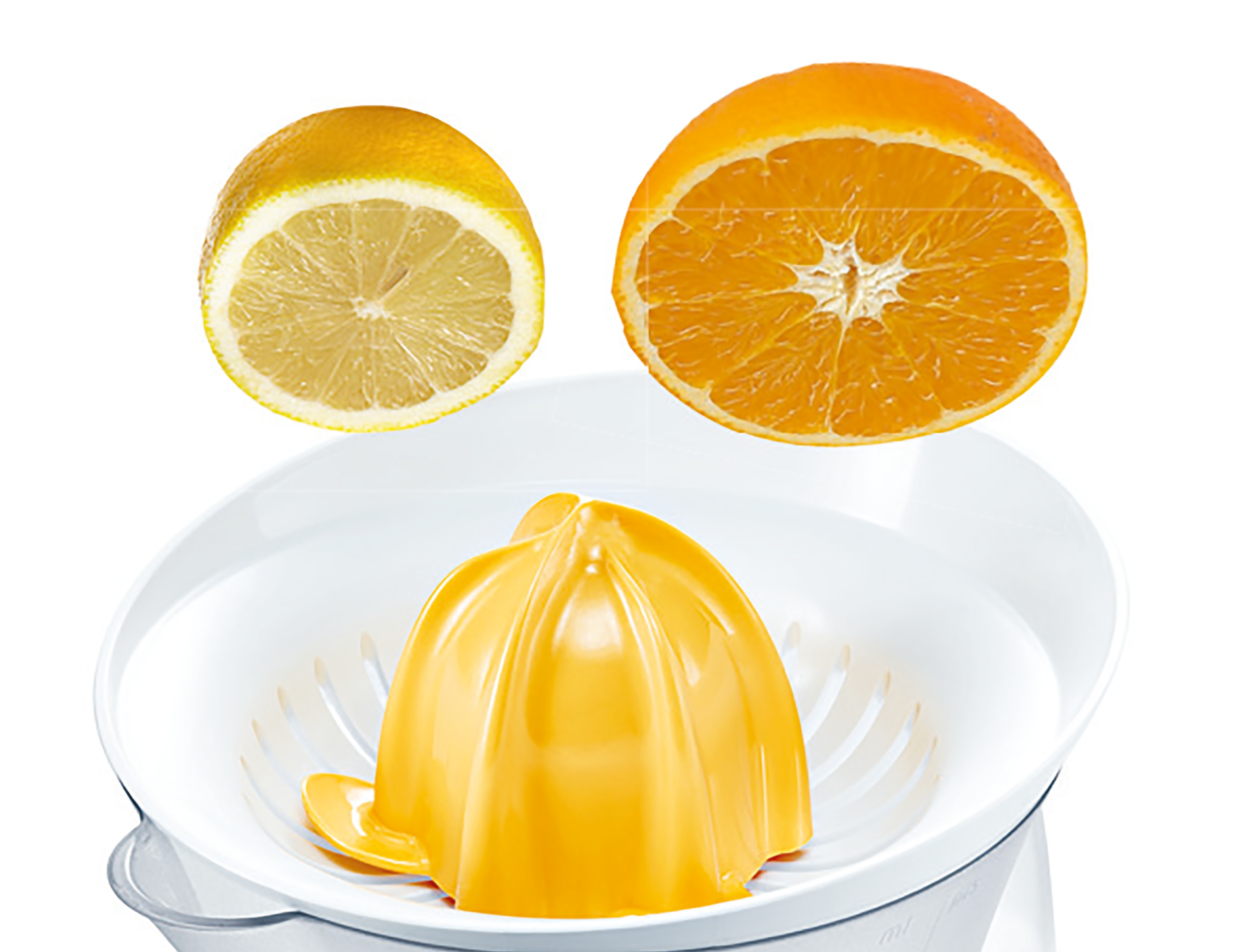 Die kompakte Zitruspresse mit großem abnehmbaren Saftbehälter, individueller Fruchtfleischeinstellung für eine hohe Saftausbeute