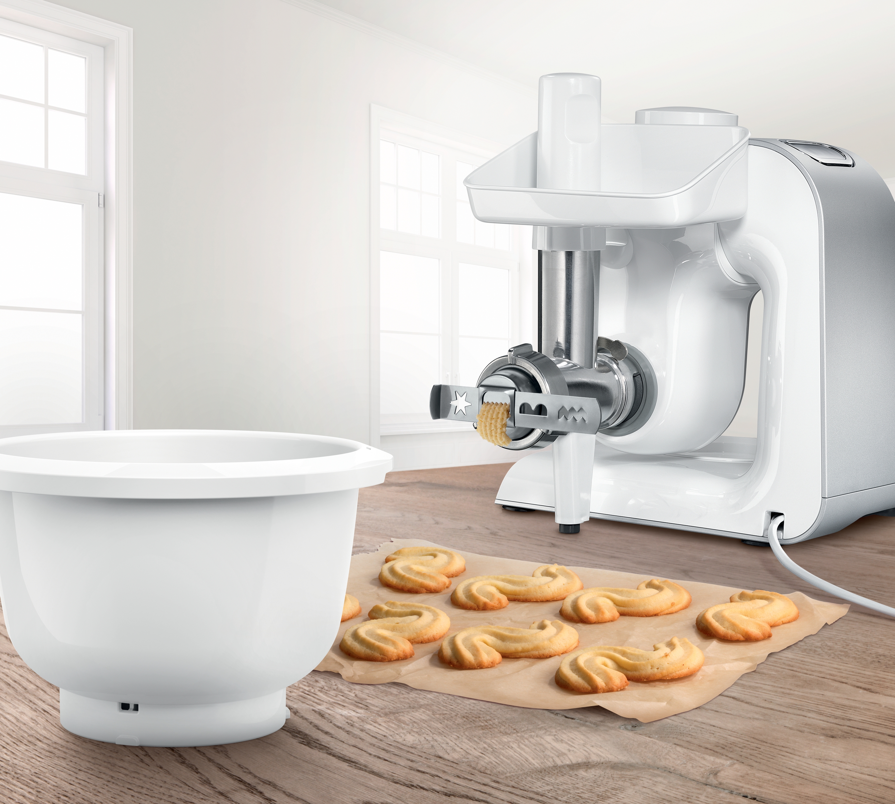 Mit dem praktischen Vorsatz für den Fleischwolf, der im Lieferumfang enthalten ist, können Sie 4 verschiedene Gebäckvarianten kreieren.