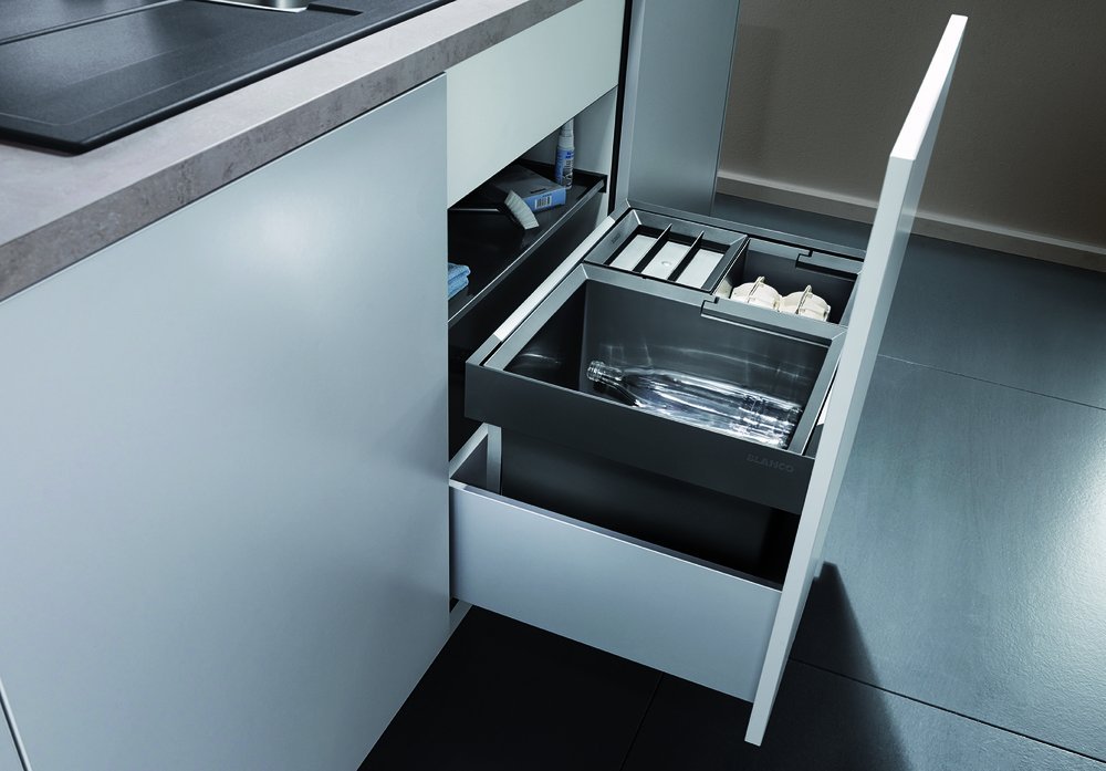 - Beachten Sie bei der Planung die Einbauhöhe des Abfallsystems, Höhe des Schubkastenbodens, Einbautiefe der Spüle mit Ablaufgarnitur und das daraus resultierende Mindestmaß für den Unterschrank.