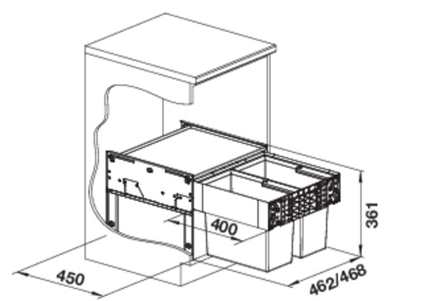 - Einbauhöhe 361 mm, Einbautiefe 400 mm, notwendiges Schrankinnenmaß für Auszugsschienen 450 mm.