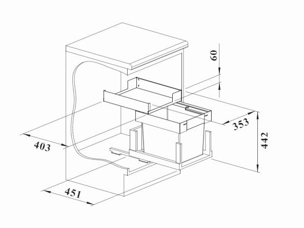 - Einbauhöhe 361 mm, Einbautiefe 400 mm, notwendiges Schrankinnenmaß für Auszugsschienen 450 mm.