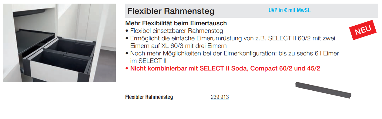 In der Planung oft vernachlässigt, im Küchenalltag wichtig: der Spülenunterschrank. Mit BLANCO SELECT II wird auch dieser Raum optimal genutzt, abgestimmt auf die Bedürfnisse Ihrer Kunden. BLANCO SELECT II vereint alle Vorteile des bewährten Abfallsystems mit neuen Eigenschaften und wird somit noch wertvoller für Küchenplanungen aller Art. Neu ist die moderne Optik mit hochwertigen Aluminiumelementen.