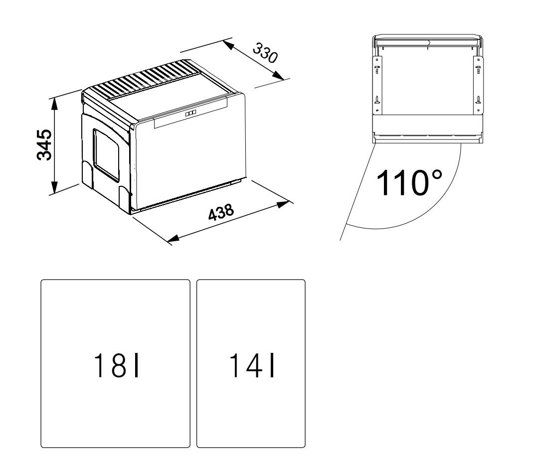 - Sorter Cube 50: Automatikauszug, Abfalltrennung 2-fach, Behälter 1x 14 L, 1x 18 L, Kunststoffabdeckung mit Ablagemöglichkeit