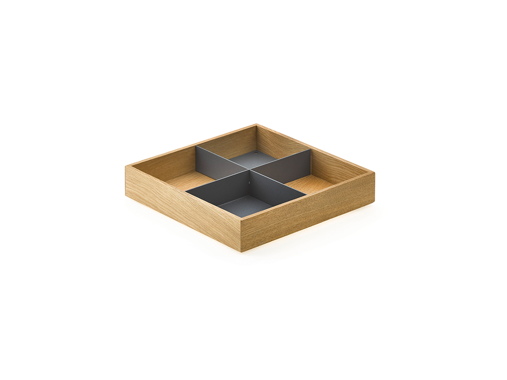 Auch im Auszug wird das flexible Konzept von Modify konsequent umgesetzt. Horizontal verschiebbare Boxen in drei Größen erlauben eine optimale Nutzung des Stauraumes. Aufgrund der unterschiedlichen Abmessungen der Boxen, können diese zum Beispiel platzsparend gestapelt werden. Ergonomisch geformte Handgriffe bieten ein optimales Handling der Boxen. Diverse Einteilungen aus pulverbeschichtetem Metall runden das Zubehörsortiment für die Boxen ab.