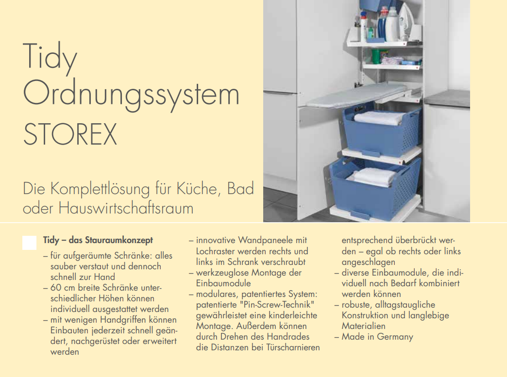 Das umfassende Tidy Ordnungssystem nutzt den vorhandenen Stauraum in Küche, Bad oder Hauswirtschaftsraum so effizient wie möglich aus. Vor allem in Wohnungen und Häusern ohne Keller oder Dachboden sind besondere Lösungen notwendig, um Raum zum Verstauen, Waschen und Wäschetrocknen zu schaffen.