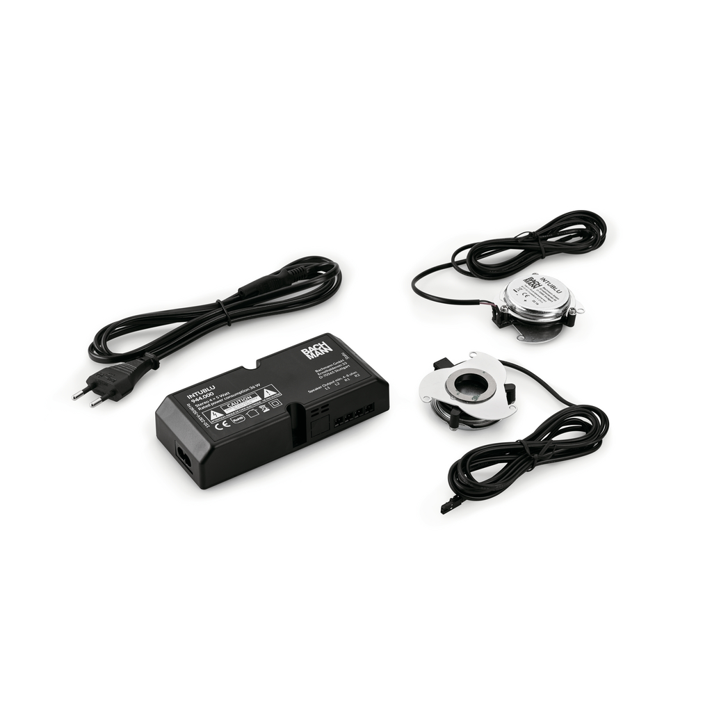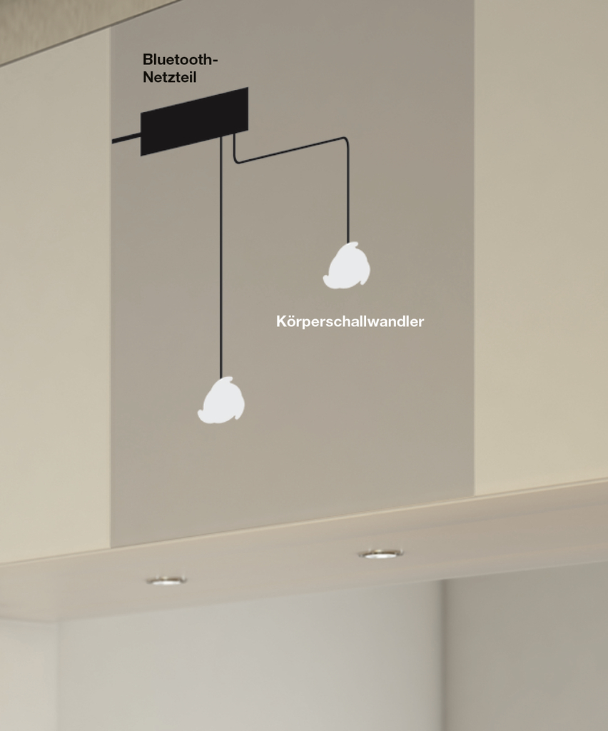 Möbeleinbaulautsprecher. Mit Bluetooth-Netzteil und zwei Körperschallwandlern. Für Oberflächen und Möbel. Das unsichtbare INTUBLU Lautsprechersystem beinhaltet einen Bluetooth-Empfänger und zwei Lautsprecher, die in Möbel oder Oberflächen eingebaut werden können. Per Bluetooth wird die Musik über Tablets, Laptops oder Smartphones gesteuert und abgespielt.