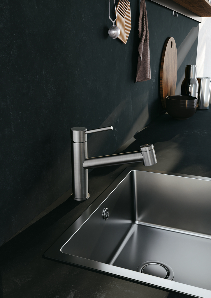 Die pure Eleganz des Edelstahls. Qualität erreicht ihre höchste Stufe, wenn sie keine Kompromisse macht. Steel geht diesen Weg. Die Spültisch-Einhandmischer sind aus reinem Edelstahl mit außergewöhnlich fein gebürsteter Oberfläche gefertigt. Ihr massives Material macht sie extrem langlebig und robust. Die puristischen Armaturen bewähren sich als hochfunktionale Küchenwerkzeuge und strahlen zugleich eine unübertroffene Wertigkeit aus. Nur Edelstahl besitzt diese kühle Eleganz, die Küchen neu inszeniert.