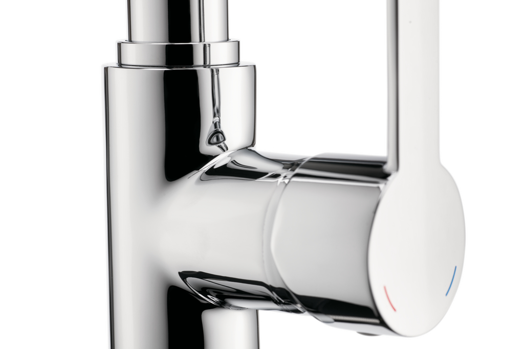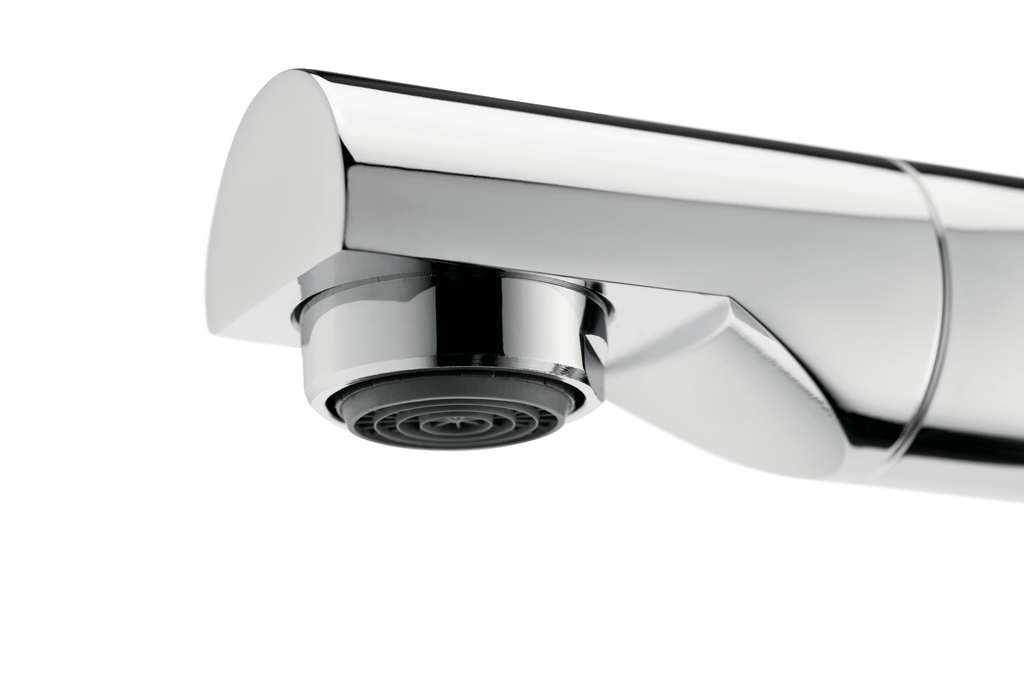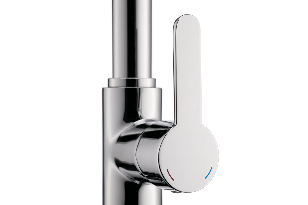 Einhebelmischer. Mit schwenkbarem Auslauf, seitlichem Hebel, Keramikkartusche und Verbrühschutz.