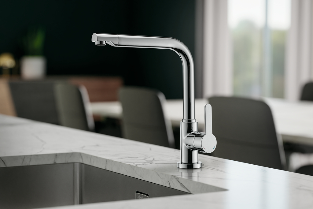 Einhebelmischer. Mit schwenk-/herausziehbarem Auslauf, seitlichem Hebel, Keramikkartusche und Verbrühschutz. Hochdruck energiesparende Kaltstart-Funktion Schwenkbereich 360° Bohr-Ø 35 mm