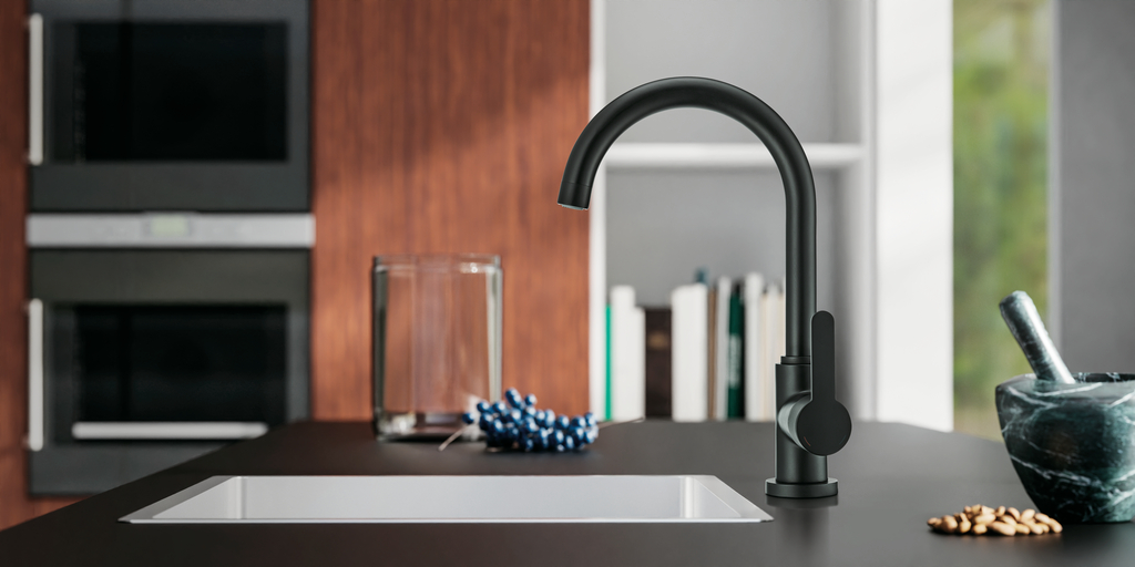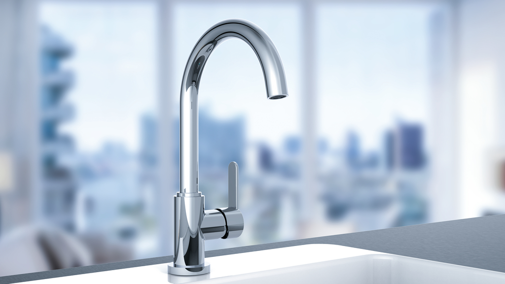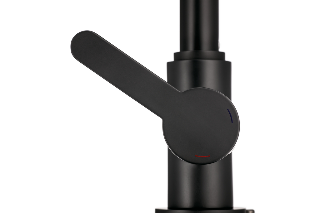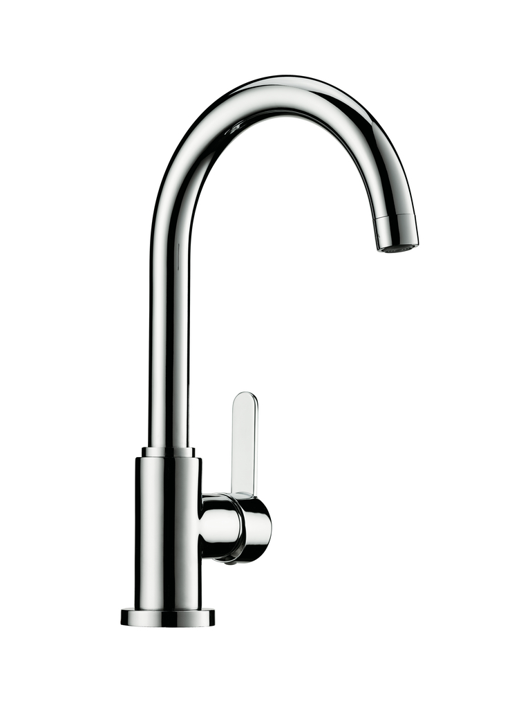 Einhebelmischer. Mit schwenkbarem Auslauf, seitlichem Hebel, Keramikkartusche und Verbrühschutz.