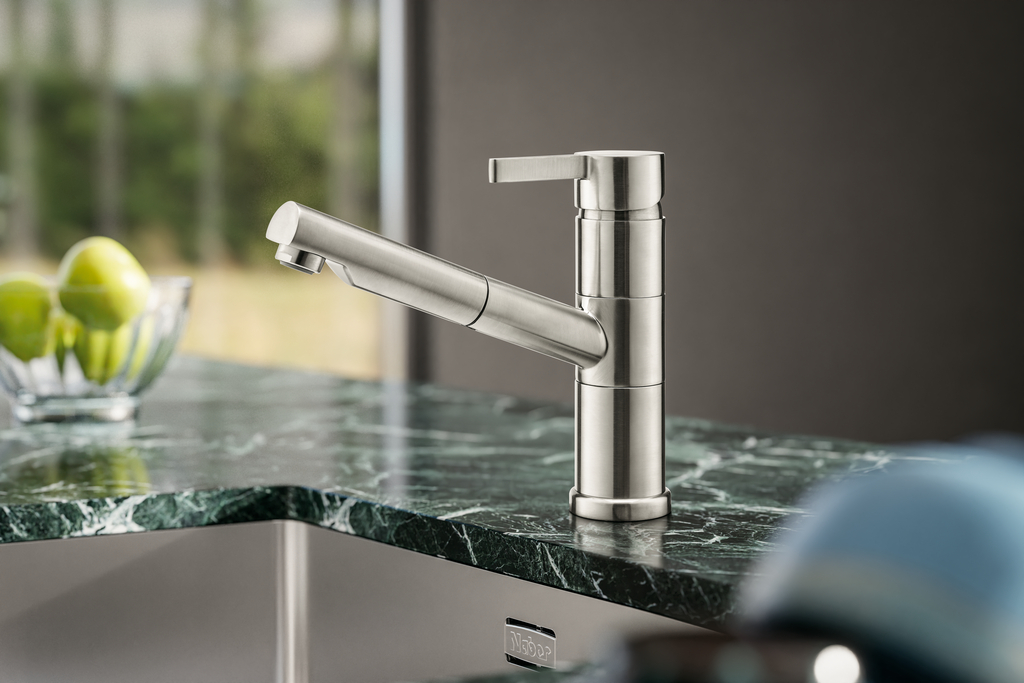 Naber Glacier 2. Einhebelmischer mit schwenk-/herausziehbarem Auslauf und Keramikkartusche. Schwenkbereich 90°, Bohr-Ø 35 mm. Hochdruck.