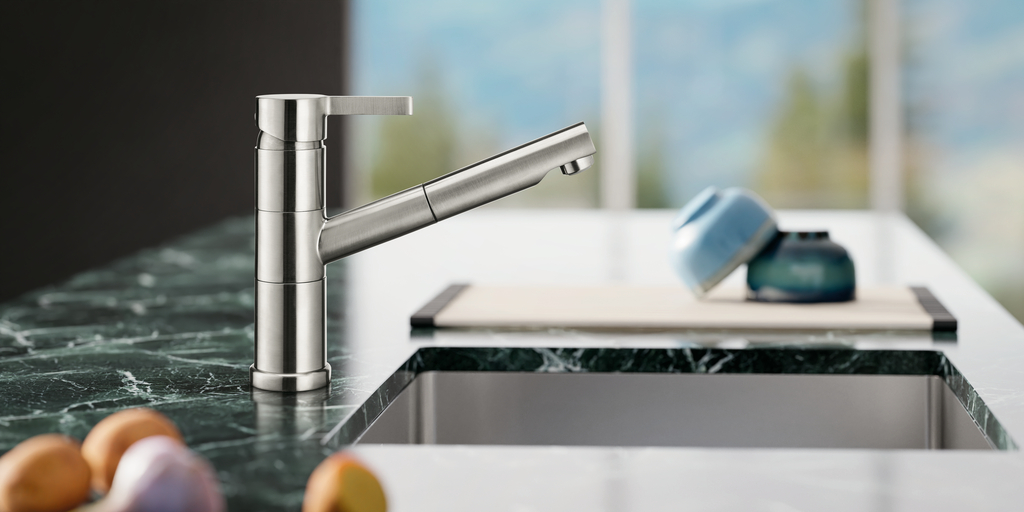 Einhebelmischer. Mit schwenk-/herausziehbarem Auslauf, Keramikkartusche und Verbrühschutz.