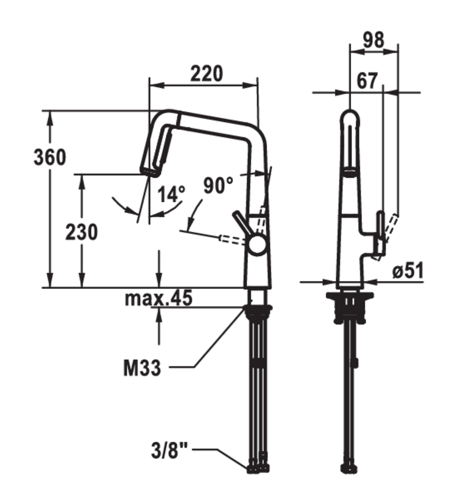 Einhebelmischer. Mit schwenk-/herausziehbarer Schlauchbrause (Strahl/Brause umstellbar), seitlichem Hebel und Keramikkartusche. Inkl. Laminarstrahlregler.