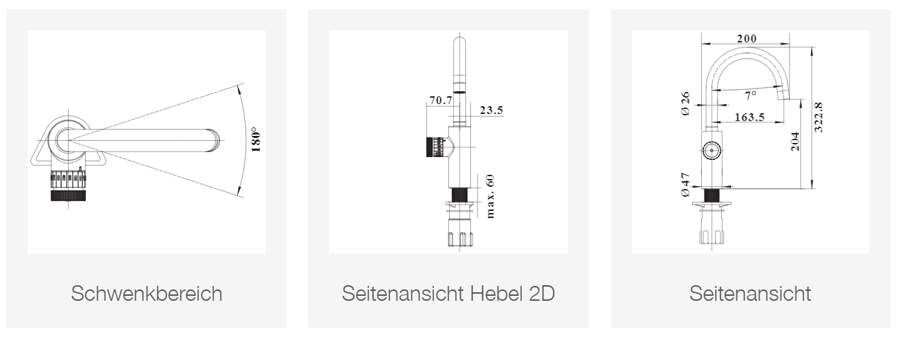 - Auslauf für veredeltes Wasser 180° schwenkbar